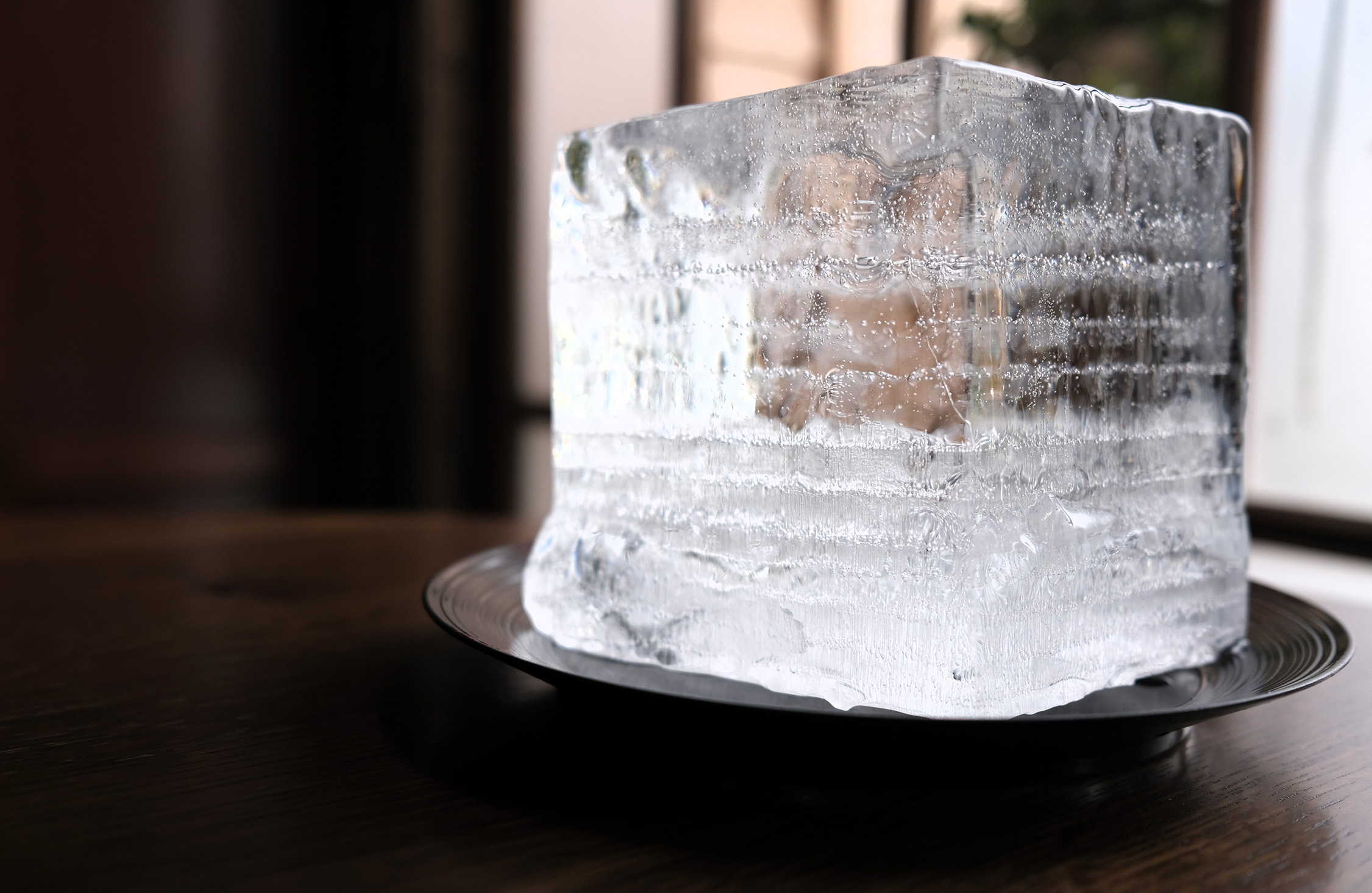 「水が氷になる時には、ろ過しても取り除けないような細かな不純物すら排除する性質があるんです。天然氷はゆっくり凍るから、丁寧に不純物が取り除かれて、純粋な氷になる。急速冷凍した氷は、あっという間に凍るからどうしても不純物を内包してしまいます。不純物が紛れ込んでいると、割れやすくなるのはわかりますよね。普通の飲食店で出される氷は噛むとすぐ砕けるでしょう。天然氷は硬いから、噛むとキューンッという感じで独特の歯ごたえがあるんです」