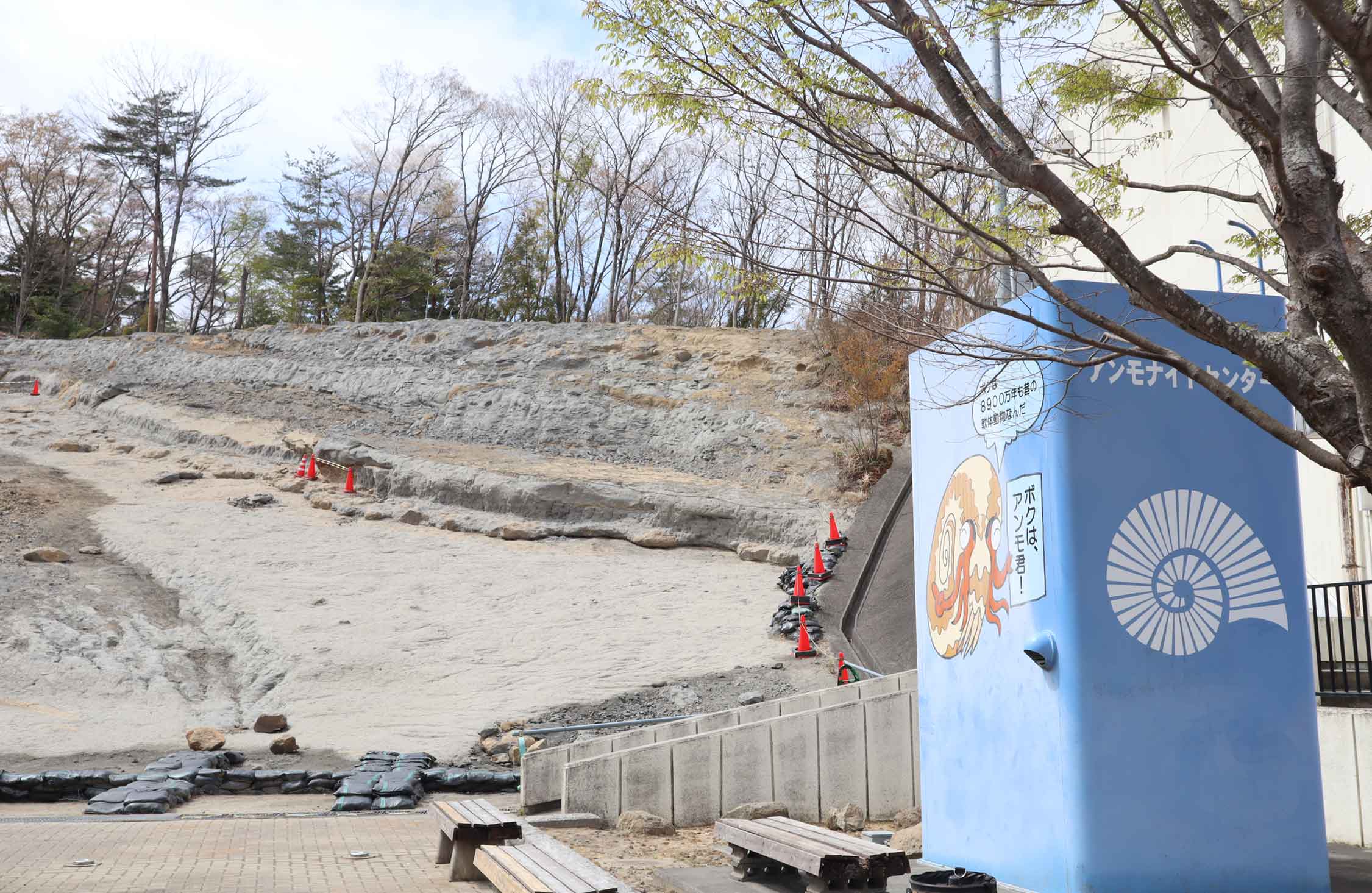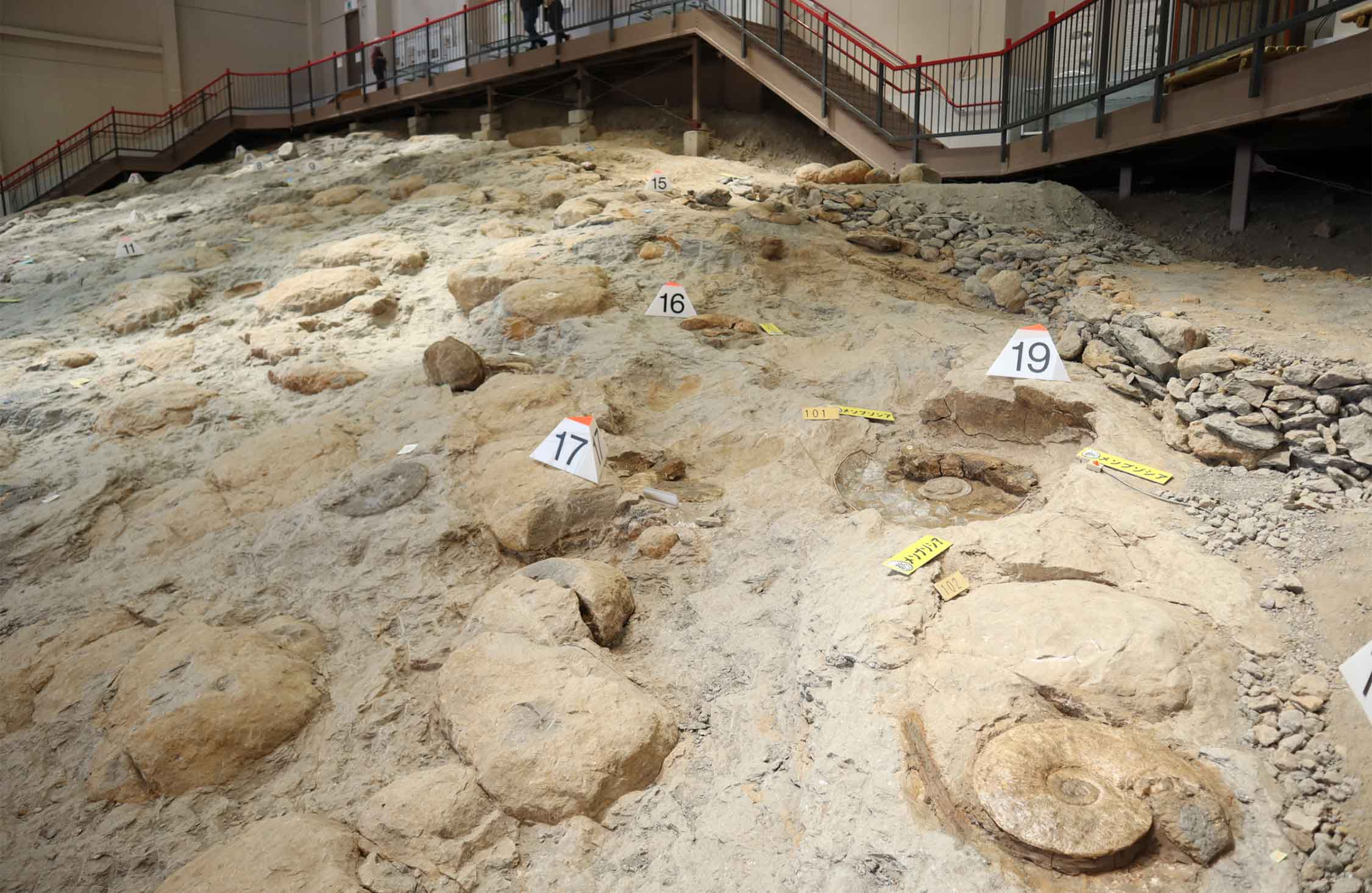館内では、巨大アンモナイト化石が密集して埋まった状態を見学することもできる。そのような場所は、日本では唯一ここだけ。世界でも数ヶ所しかないという。