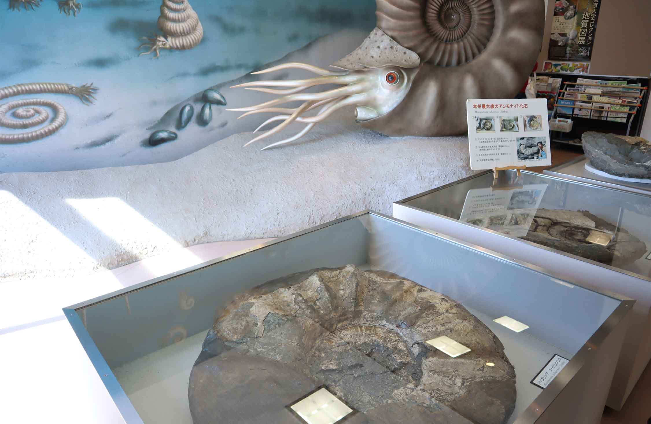 館内に入ると、直径約1メートル近い巨大アンモナイトたちが出迎えてくれた。このうちのひとつは、センターの体験発掘場で掘り出されたものだという。