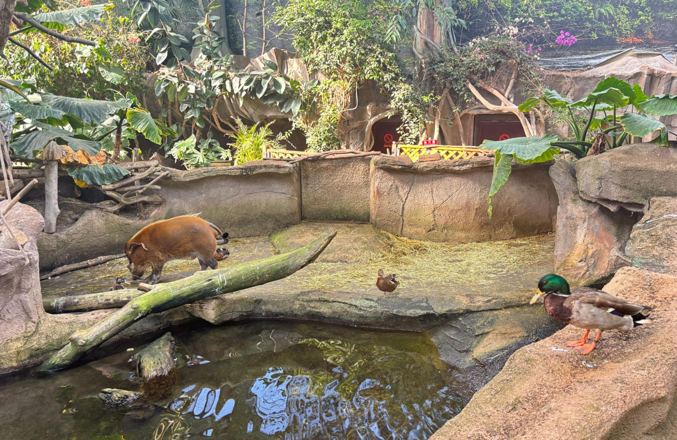 熱帯の湿地環境を再現した施設内では、アカカワイノシシは水辺で鳥たちと戯れ、ワオキツネザルが木から木へと軽やかにジャンプしていた。