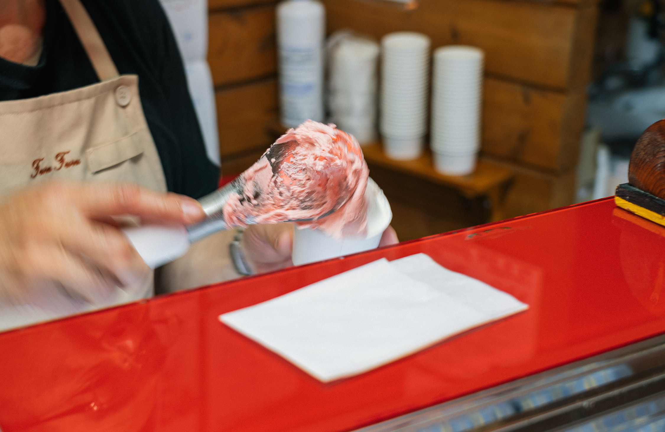 「うちのソルベは乳製品を使わないんですよ。果物のアイスは、果実と糖分と水でつくっています」
