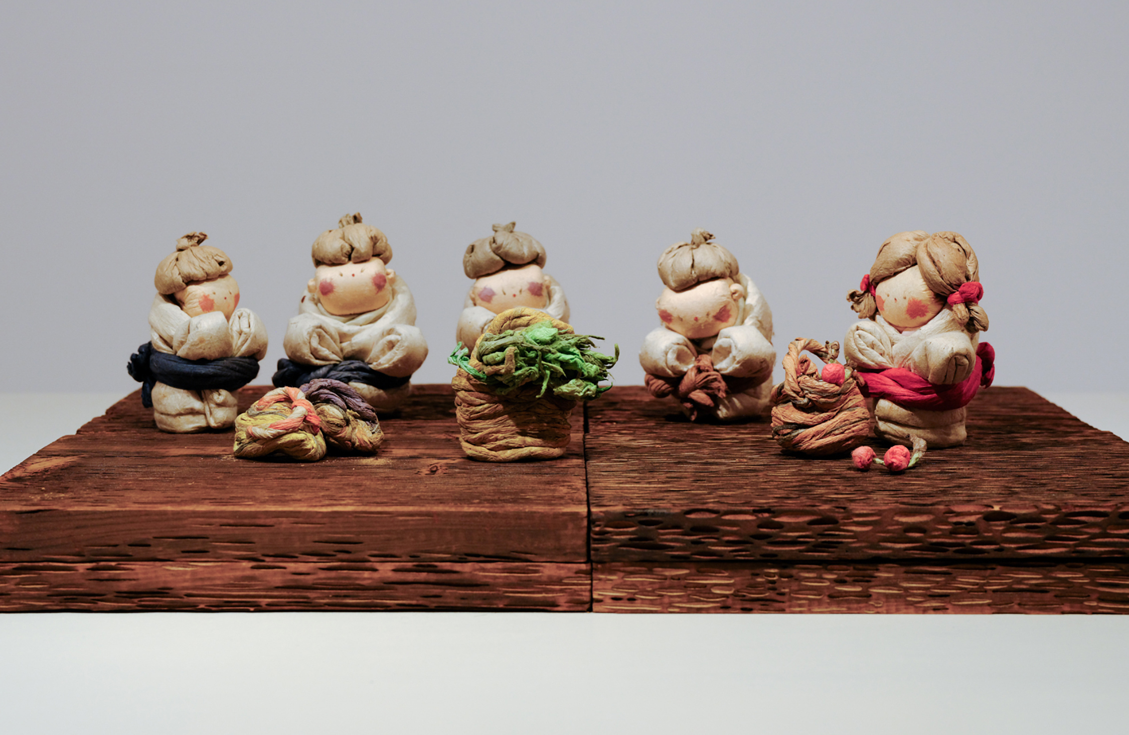 展示室に入ると、写真で見たような作品がずらりと並んでいる。それが「わらべ」と呼ばれている作品シリーズだ。極端にデフォルメされた大きな丸い顔や手。落ち着いた美しい色合いの紙を何枚も重ねて形を作ったのであろう、ふっくらとした着物。このボリュームとは対照的に、見えないほど細く小さく描かれた目、鼻、口が、なんとも微笑ましい。昔の日本にいたかわいらしい子どもたちの姿だ。