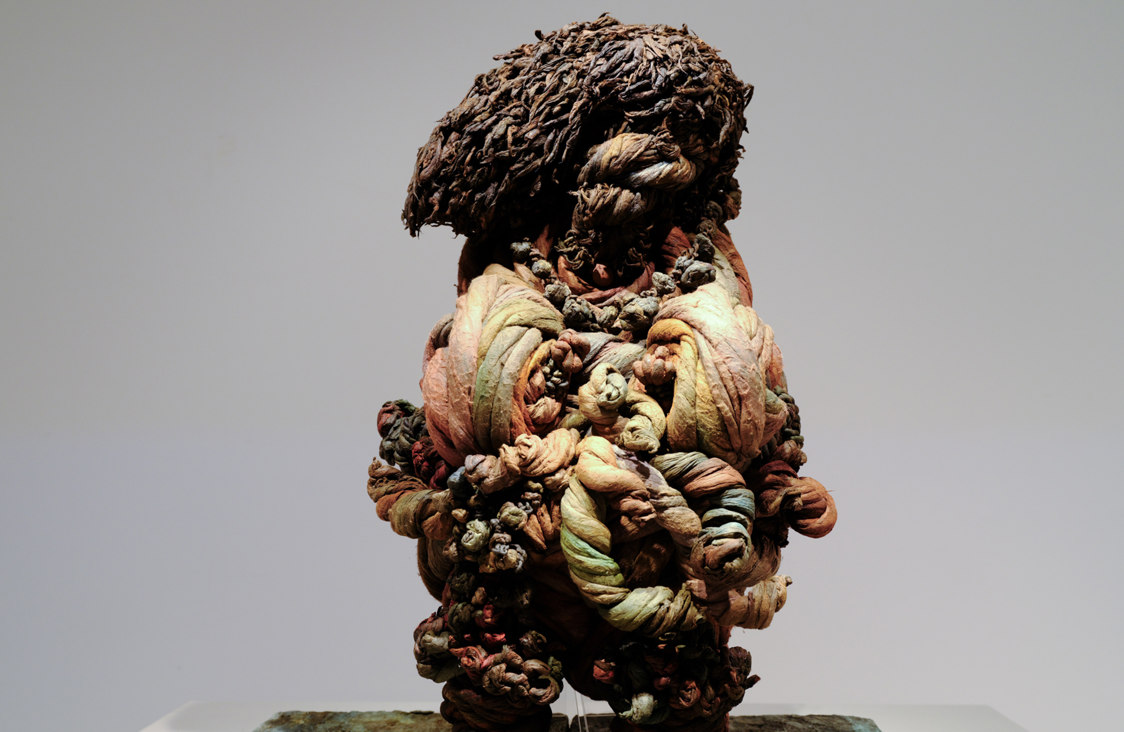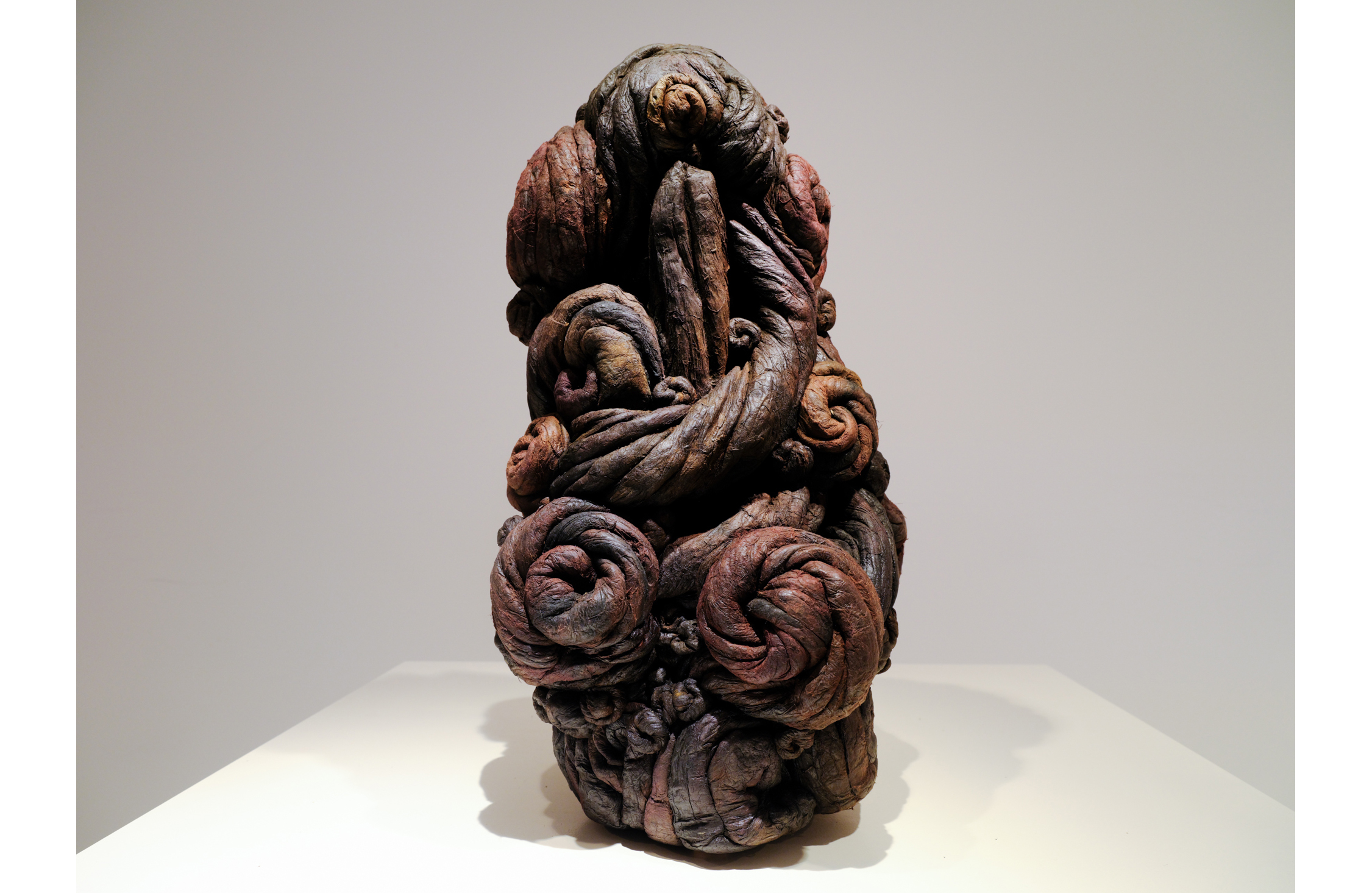 写真集にはなかった、なにがなんだかまったく見当もつかない、奇妙な形の作品もあった。それが「日本の神々」という作品シリーズだ。人形だと言われなければ、誰もそう思わないに違いない。無数の和紙をひねりあげ、絞り、絡ませ、縛り上げて作った、かつて見たことがない造形だ。よく目を凝らすと、造形全体の1/1000にも満たない程の小さな顔が、埋もれている。色も黒や茶色、灰色が全すべて混じり合ったような、なんともいえない色で形作られているものが多い。