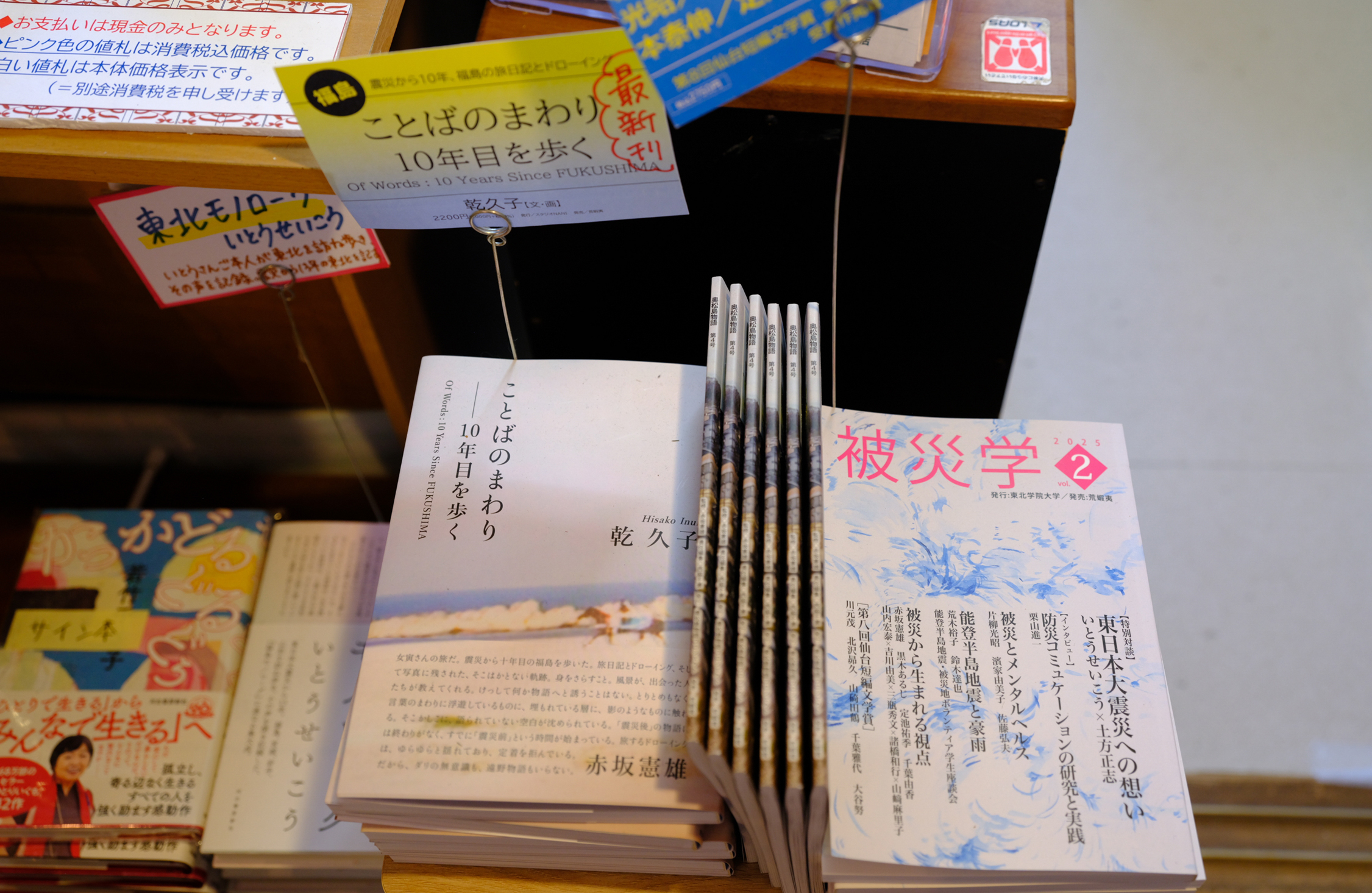 そうそう、そして忘れてはいけない。「あらえみし」は古本屋だけど、『被災学』や『仙台文学賞』など、出版社「荒蝦夷」が手がける新刊本も、レジ脇にたくさん置いてある!