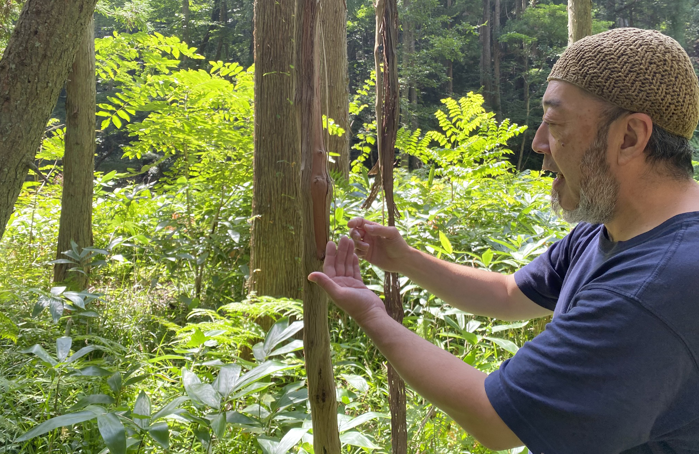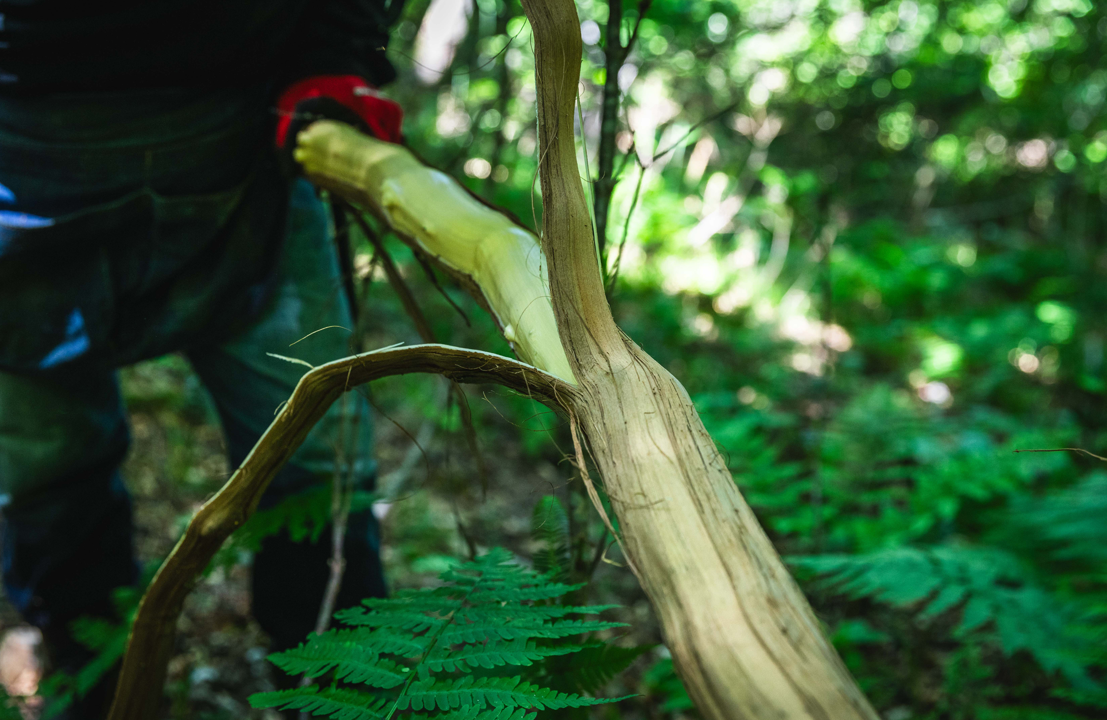 「蔓の外側のはがれやすい部分が『鬼皮』、その下の滑らかできれいな皮を『一番皮』といいます。この一番皮を蔓から丁寧にはがし、ひごの元になる皮を得ます。一番皮は、毎年成長して鬼皮に変化しますが、ちょうど梅雨時期に植物の水管で押し出され、鬼皮になる準備を始めるんです。その2週間だけが一番皮を蔓からはがすことができる唯一の期間です。だから僕らはそこを狙って山に入るんですよ」