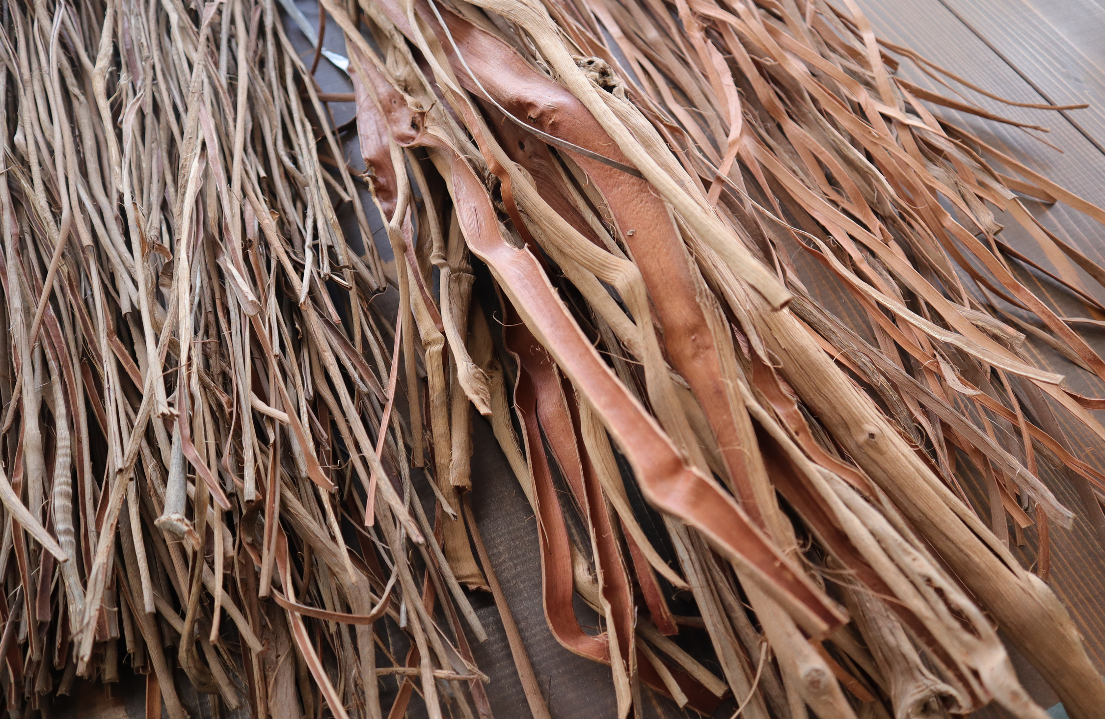 山で採った山ぶどうの皮は「原皮」と呼ばれる。この原皮を、まず3ヶ月から数年かけて、乾燥・熟成させると、一番外側の層である「一番皮」がしっかりと定着する。この原皮を濡らして、丁寧に切り裂いてリボン状のひごに加工する。