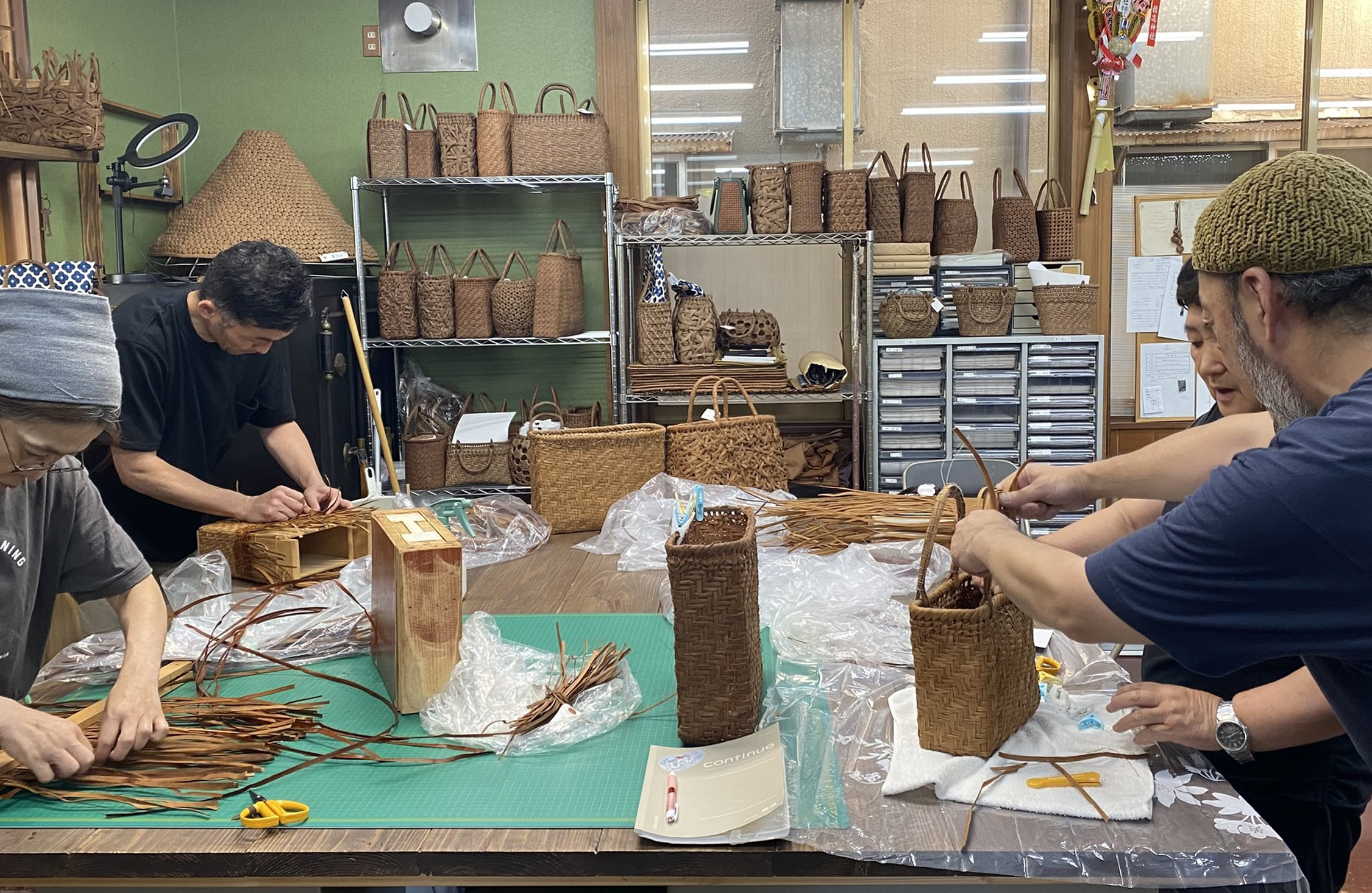 私も、少しだけ籠編みを体験させてもらった。水で湿らせたひごを木型に合わせ、2本ずつ飛ばして編む「網代(あじろ)編み」だ。湿らせたひごに触れると、不思議と心が落ち着いた。編み進めると、ピタっと決まる瞬間がある。その感覚は思った以上に気持ちがよく、もし通える場所に工房があったら、絶対に通いたいと思ったほどだ。