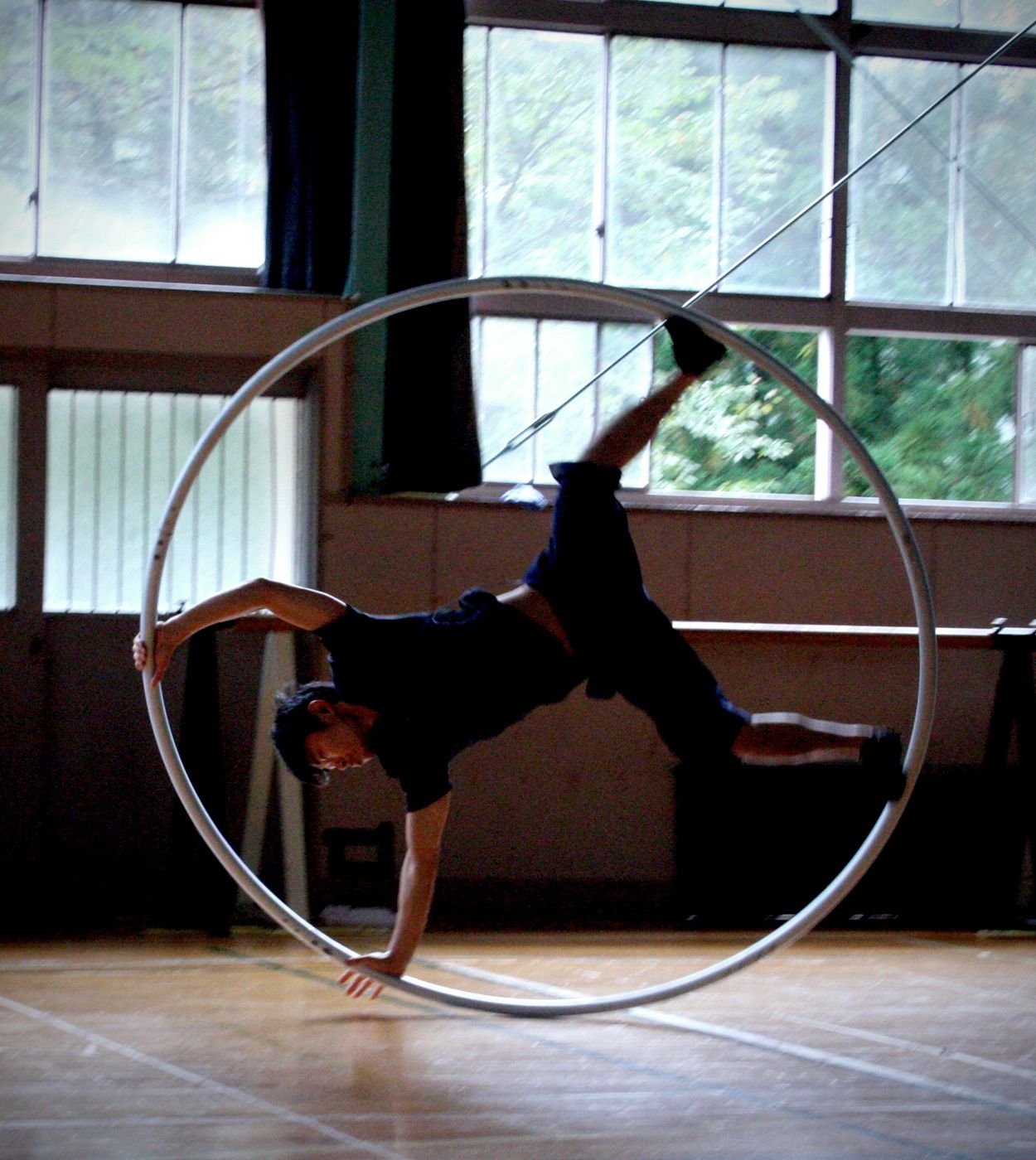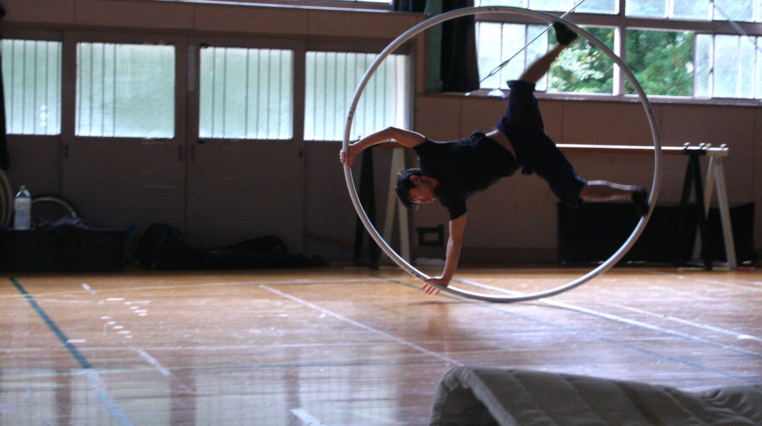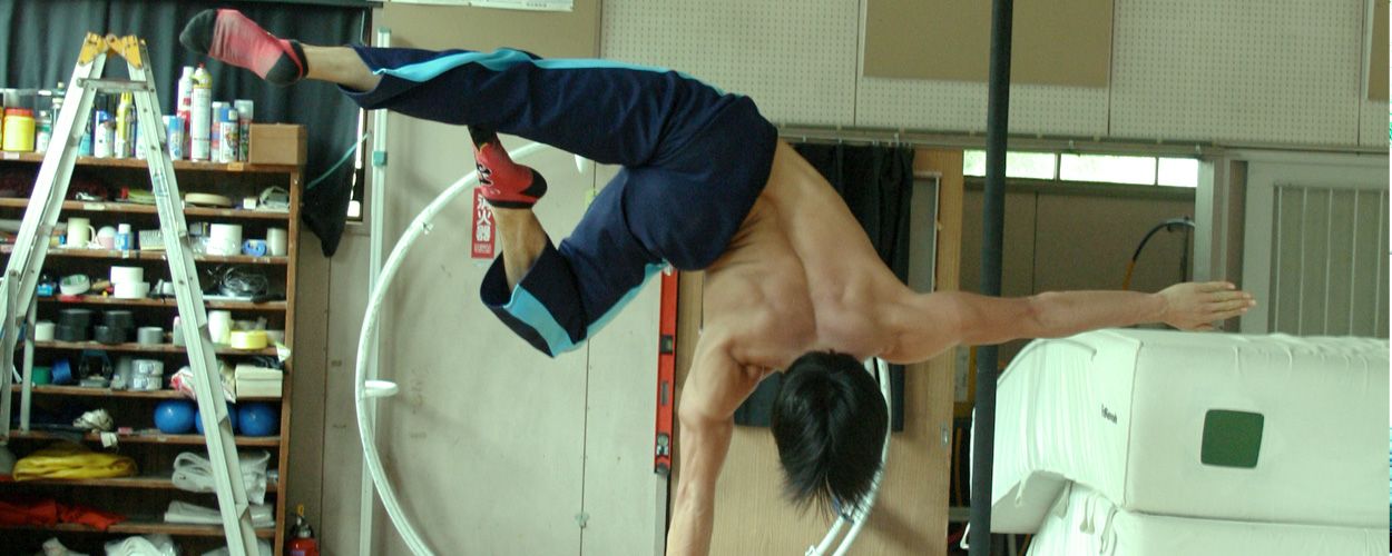 油布さんが練習している姿はとてもストイックで、一分も、一秒も無駄にしないという気迫すら感じた。いま取り組んでいるのは、大きな輪のなかで両手両足を踏ん張り、ぐるんぐるんと回転するパフォーマンス。この技を習得するために、自分でカナダから器具を輸入したそうだ。彼の本気度が伝わってくる話である。