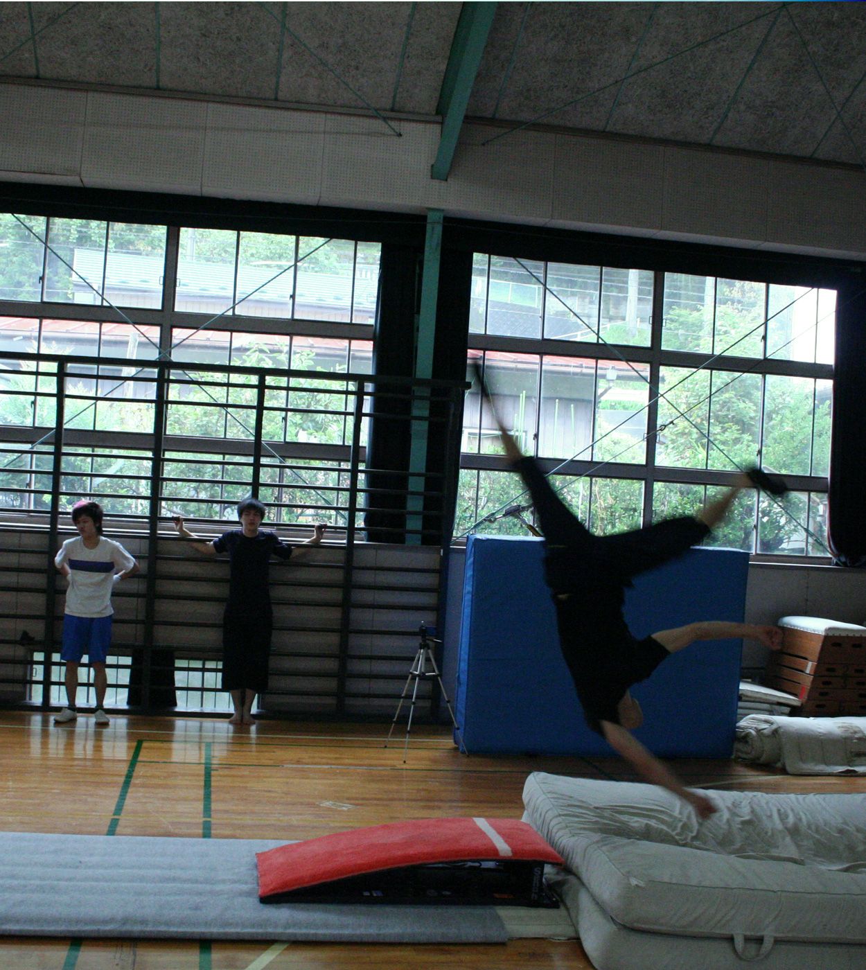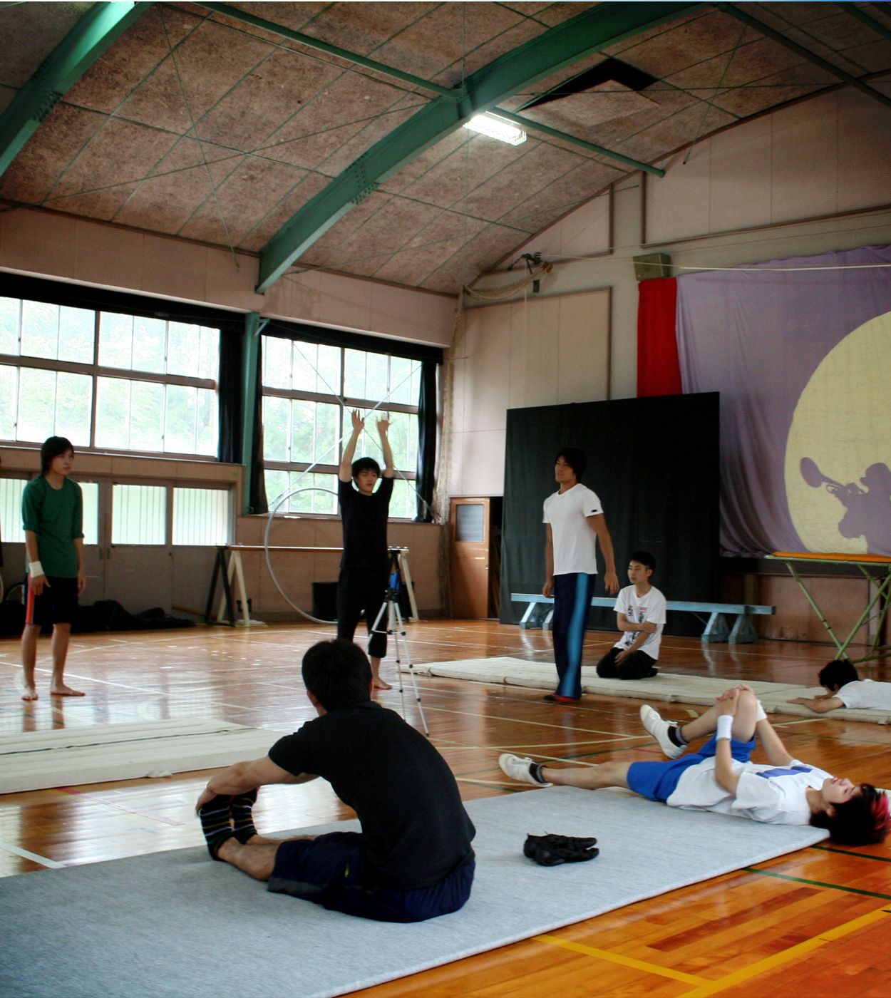 体育館の入り口で、事務局長の関口渉さんと挨拶を交わす。少しドキドキしながら中に入ると、運動着姿の若者たちが思い思いに準備運動をしていた。床にはマットが敷かれ、跳び箱が置かれている。天井には水銀灯。そこには、長らく目にすることもなかった、でも懐かしい体育館の風景が広がっていた。