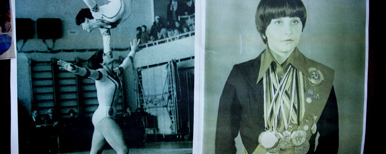 10時半頃、この学校唯一の先生が体育館に入ってきた。生徒を指導するのは、ウクライナ人女性のテシェンコワ・ナジェイジダさん、61歳。アクロバット体操の選手として3度の世界選手権優勝を誇る、ウクライナのキエフ国立サーカス学校の元教師だ。生徒たちには「ナージャ先生」と呼ばれている。体育館の入り口にはメダルを山ほど首に巻いたナージャ先生の若かりし頃の写真が飾られている。