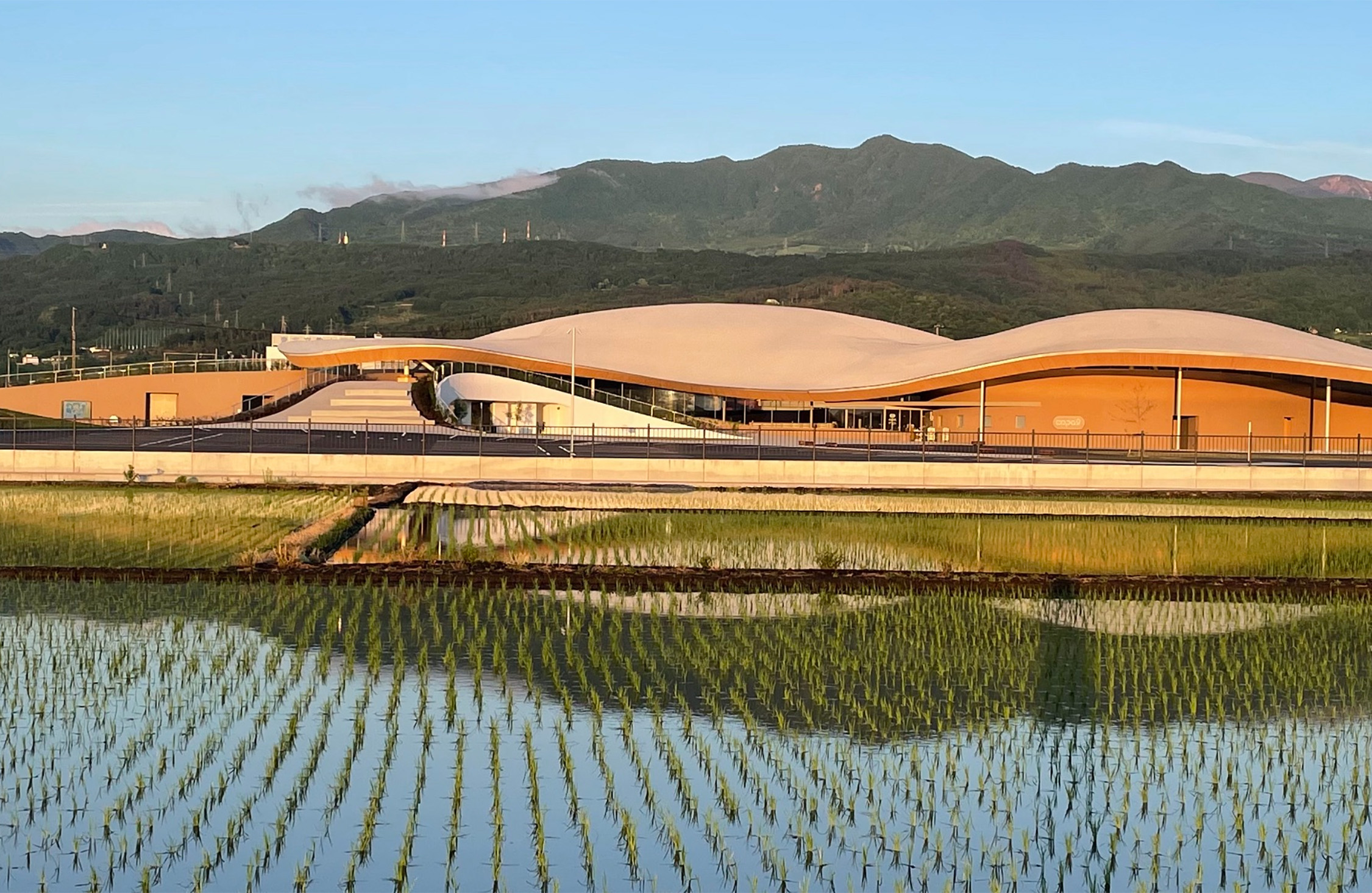 コパルの外観は、田んぼに浮かぶ宇宙船のようだ。山か、雲か、曲線だらけのフォルムが面白い。