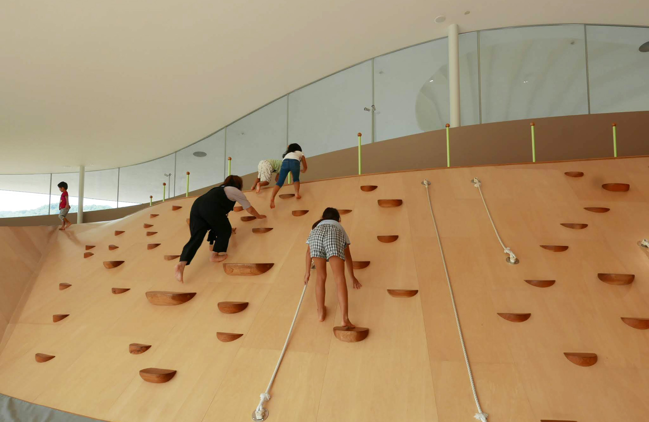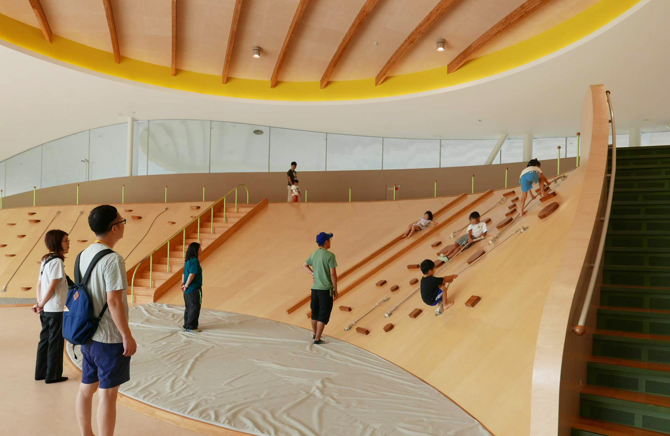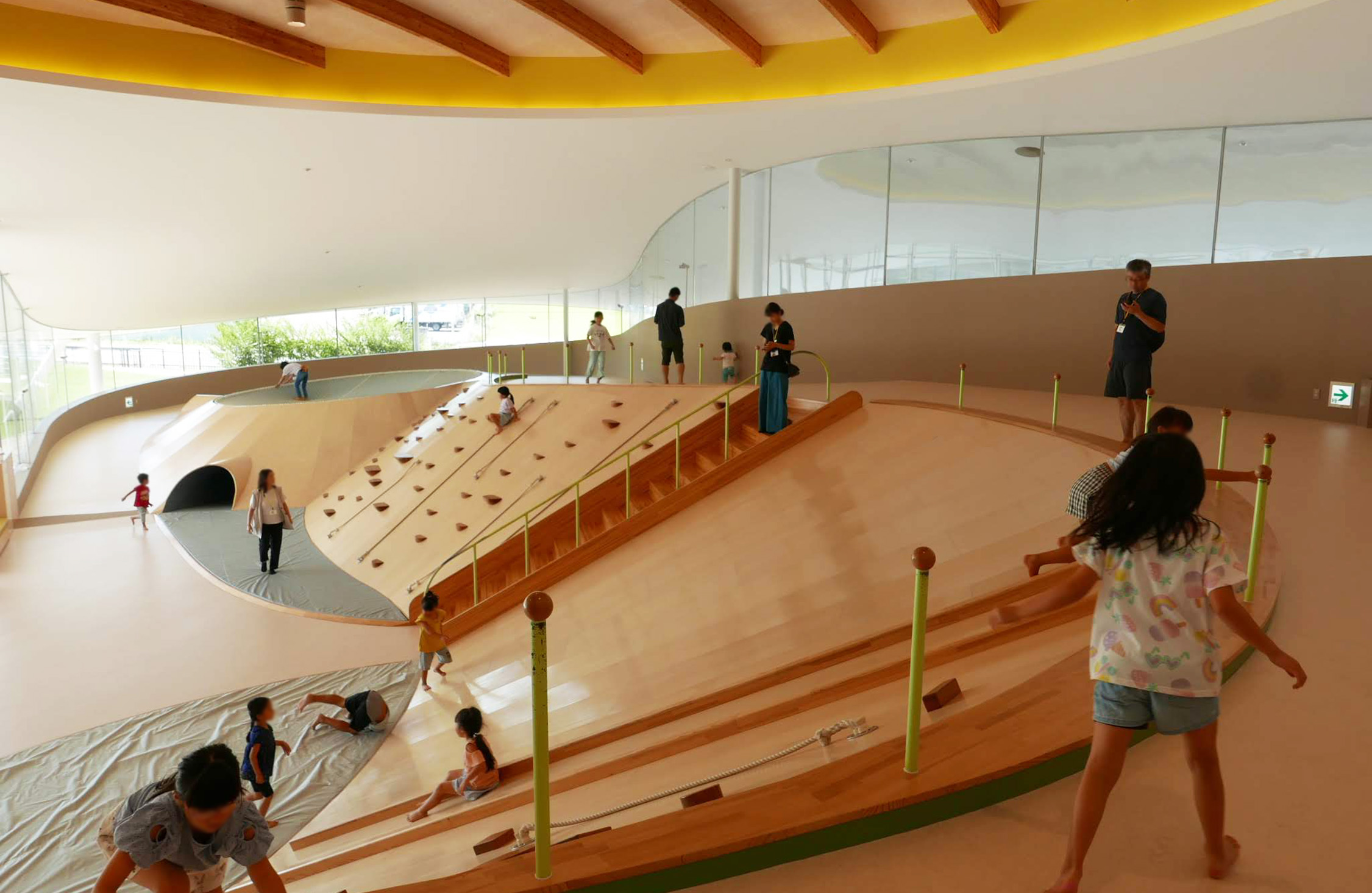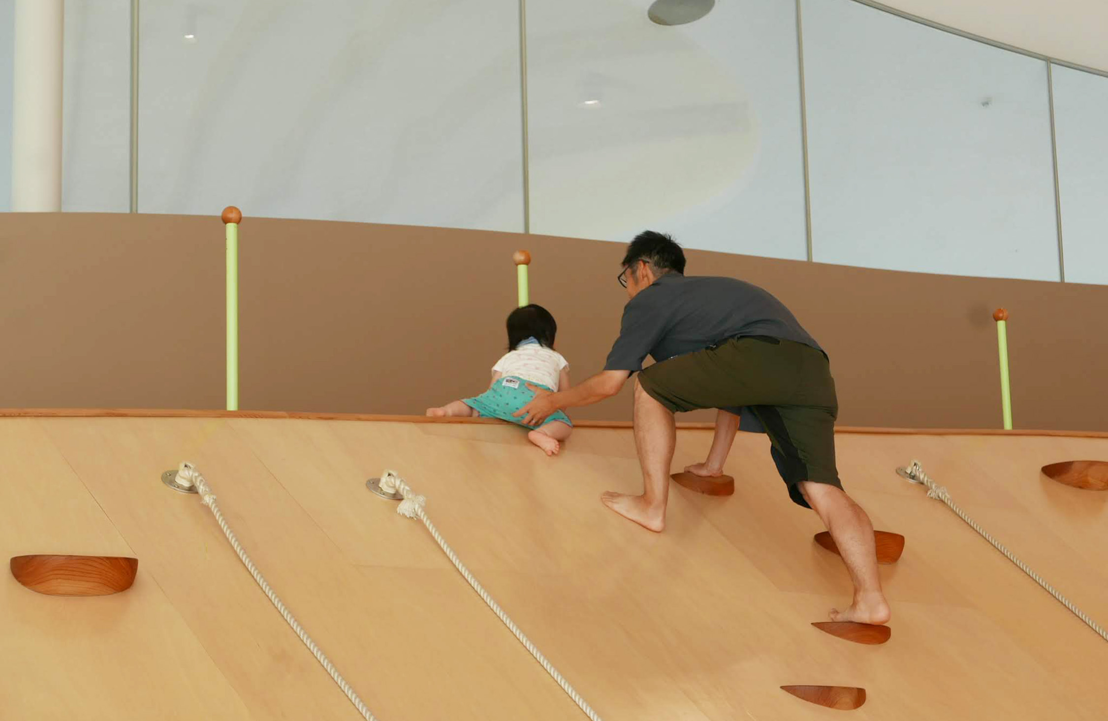まるで、近所の裏山をそのまま屋内に持ち込んだような、起伏のある空間。子どもたちがロープを掴み、ボルダリングの突起を蹴って、思い思いに丘を登る。「よし、一気に行くぞ!」と助走をつけて駆け上がる子、ゆっくり着実に進む子。頂上は、そのまま滑り台になる。登るか、滑るか、別の道を探すか。ここに「正しい遊び方」はない。すべては、子ども次第だ。