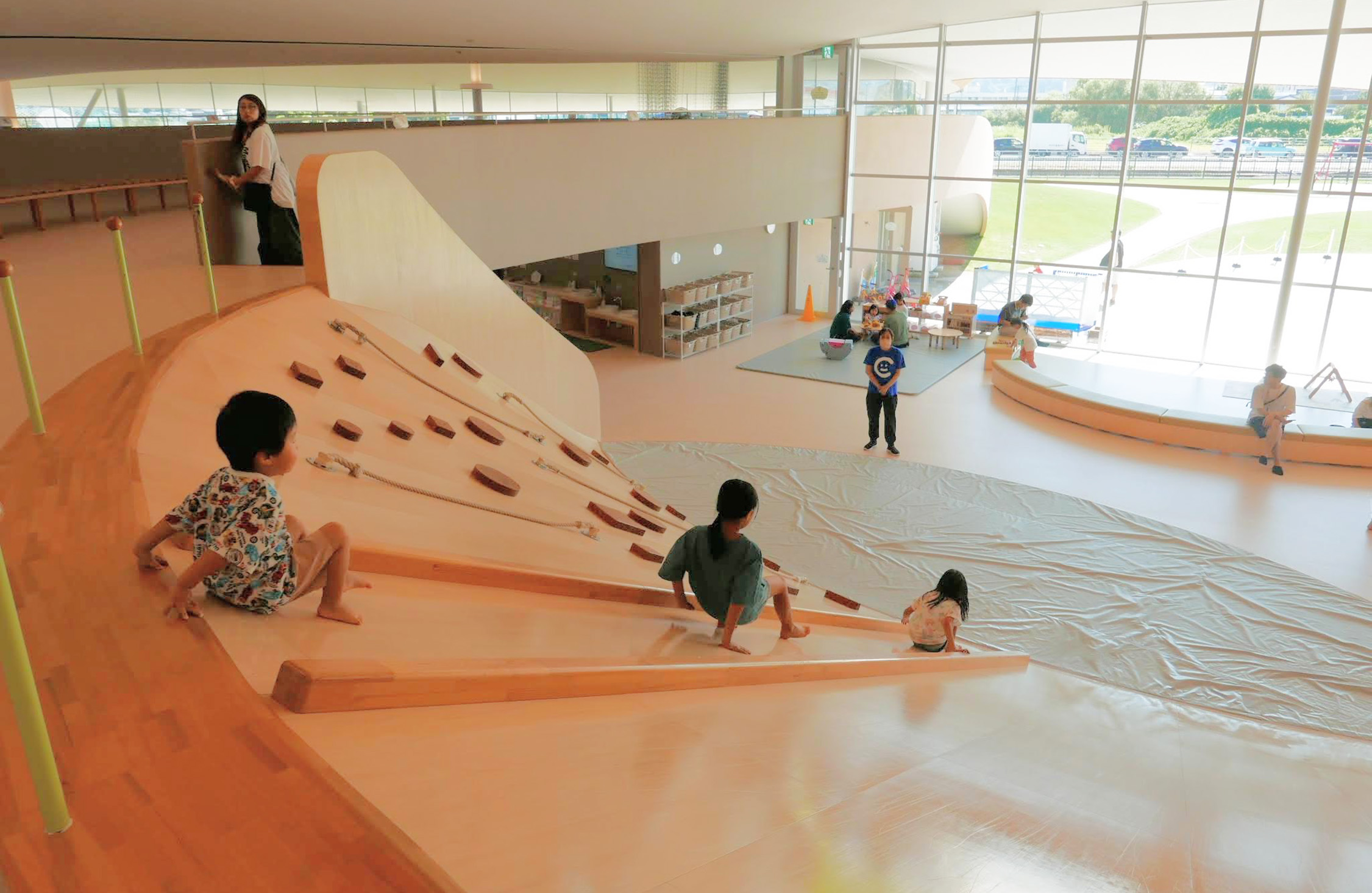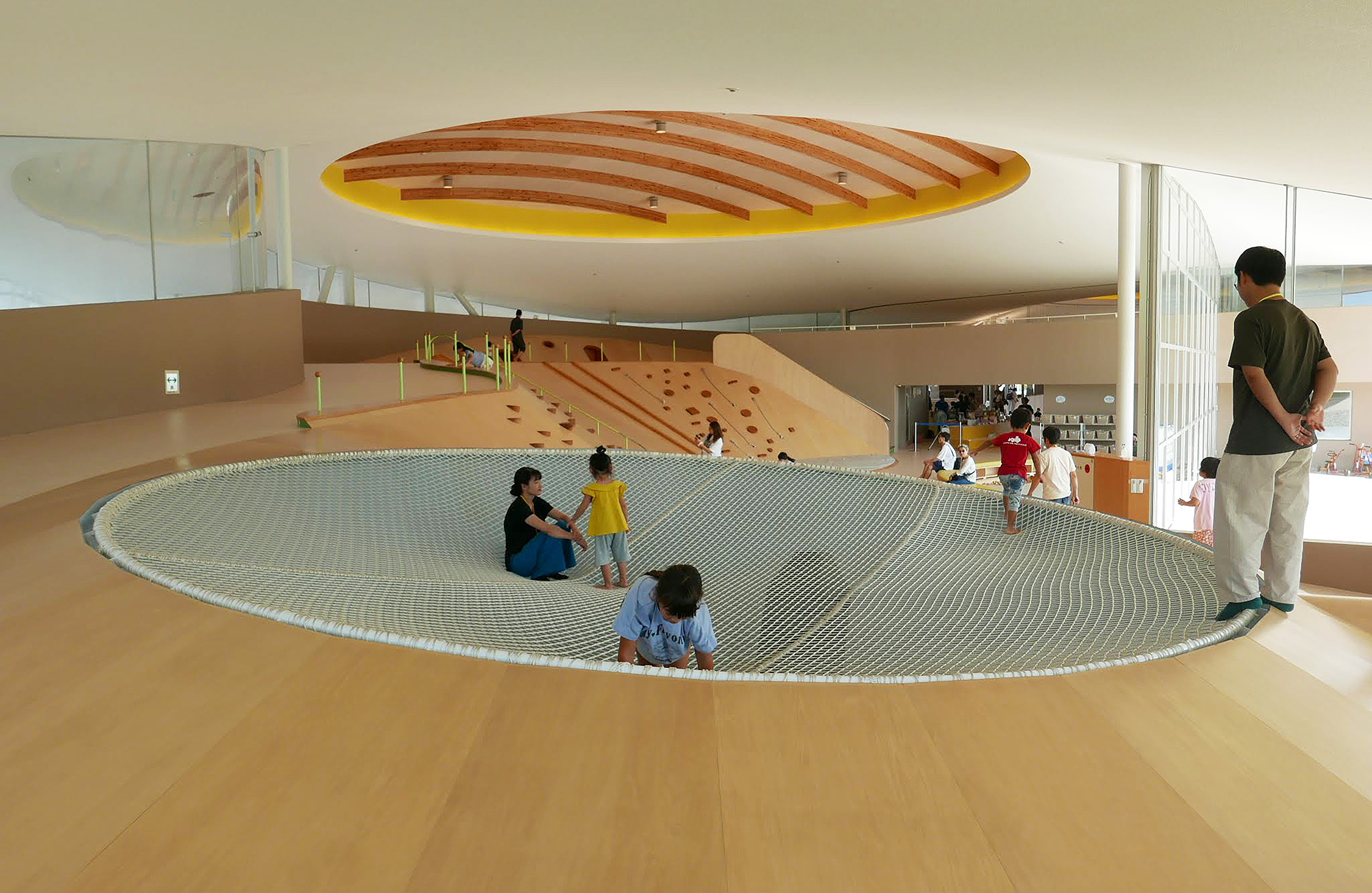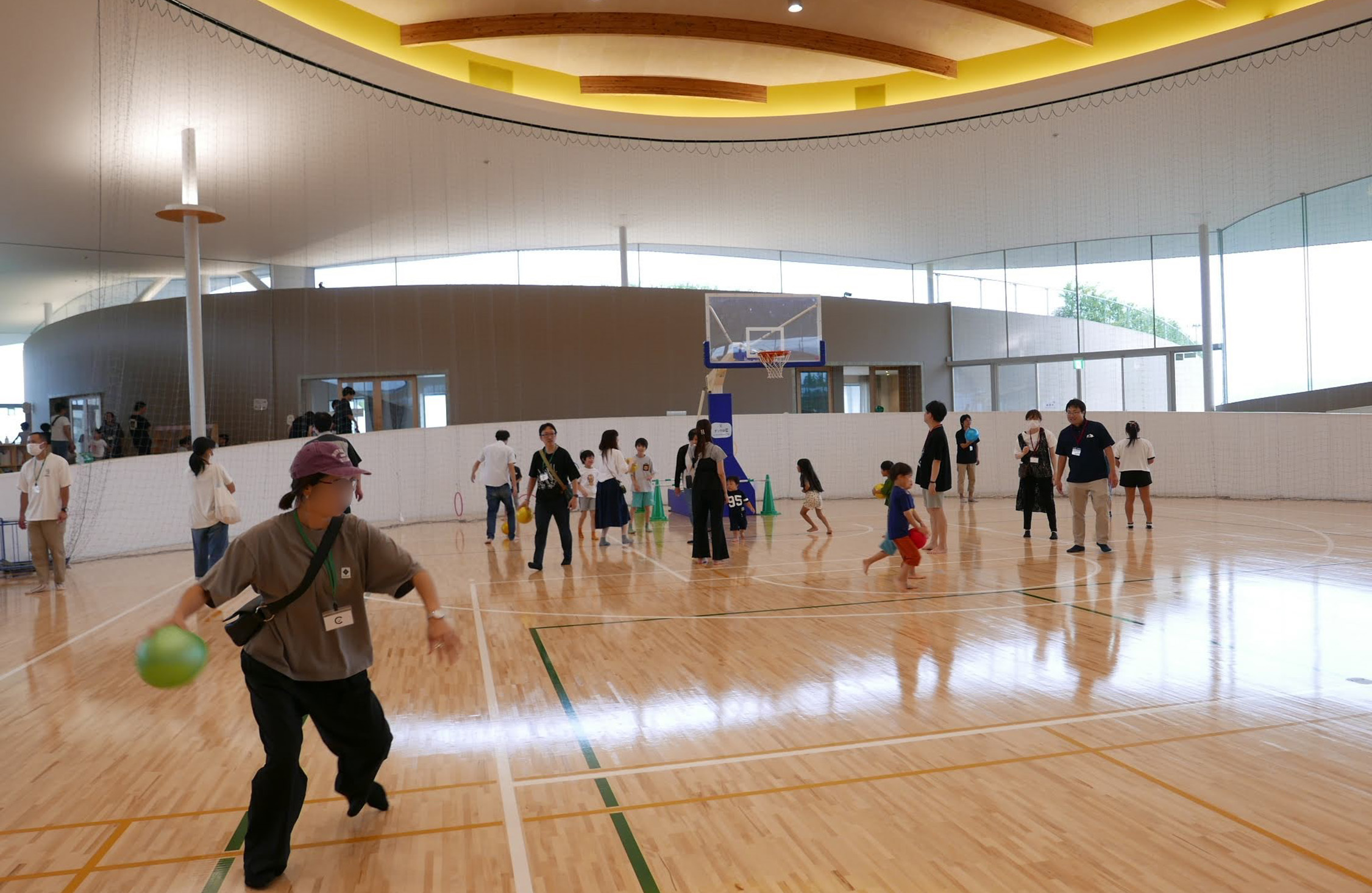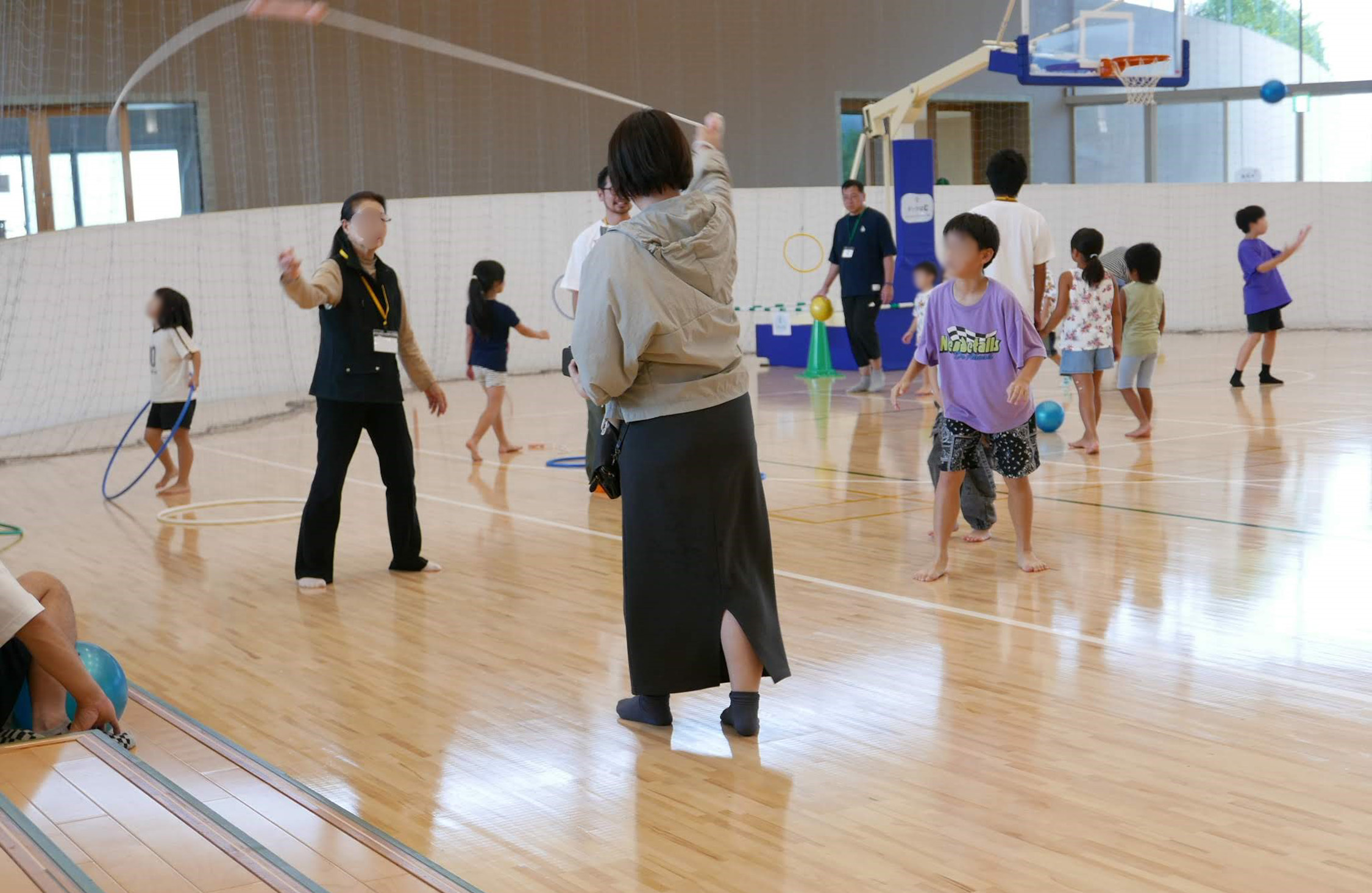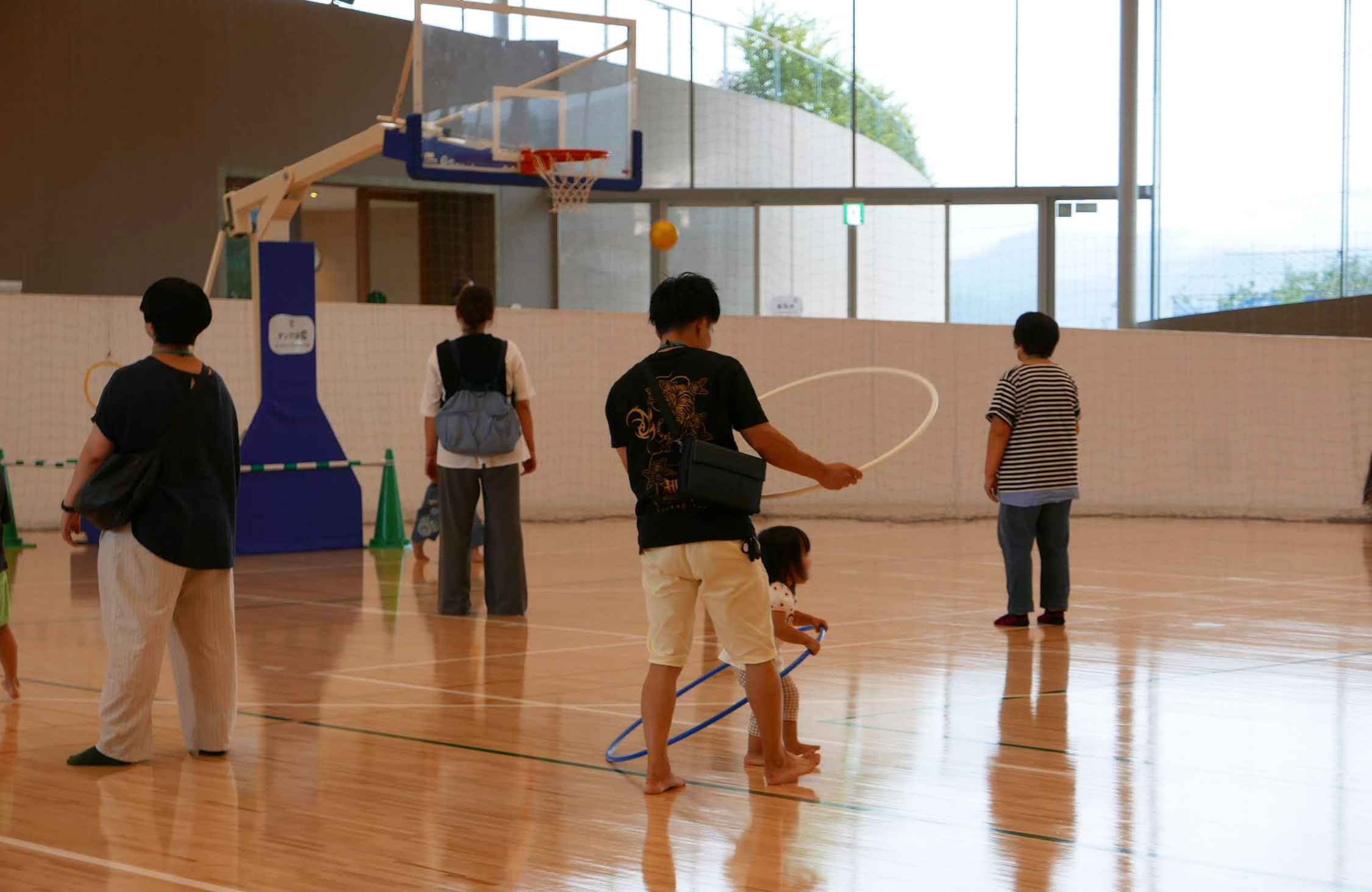 土曜の午後、体育館は歓声に包まれていた。ボール投げ、フラフープ、縄跳び、バランスロープ、卓球.....。.子どもも大人も一緒になって、自分だけの遊び方を見つけている。