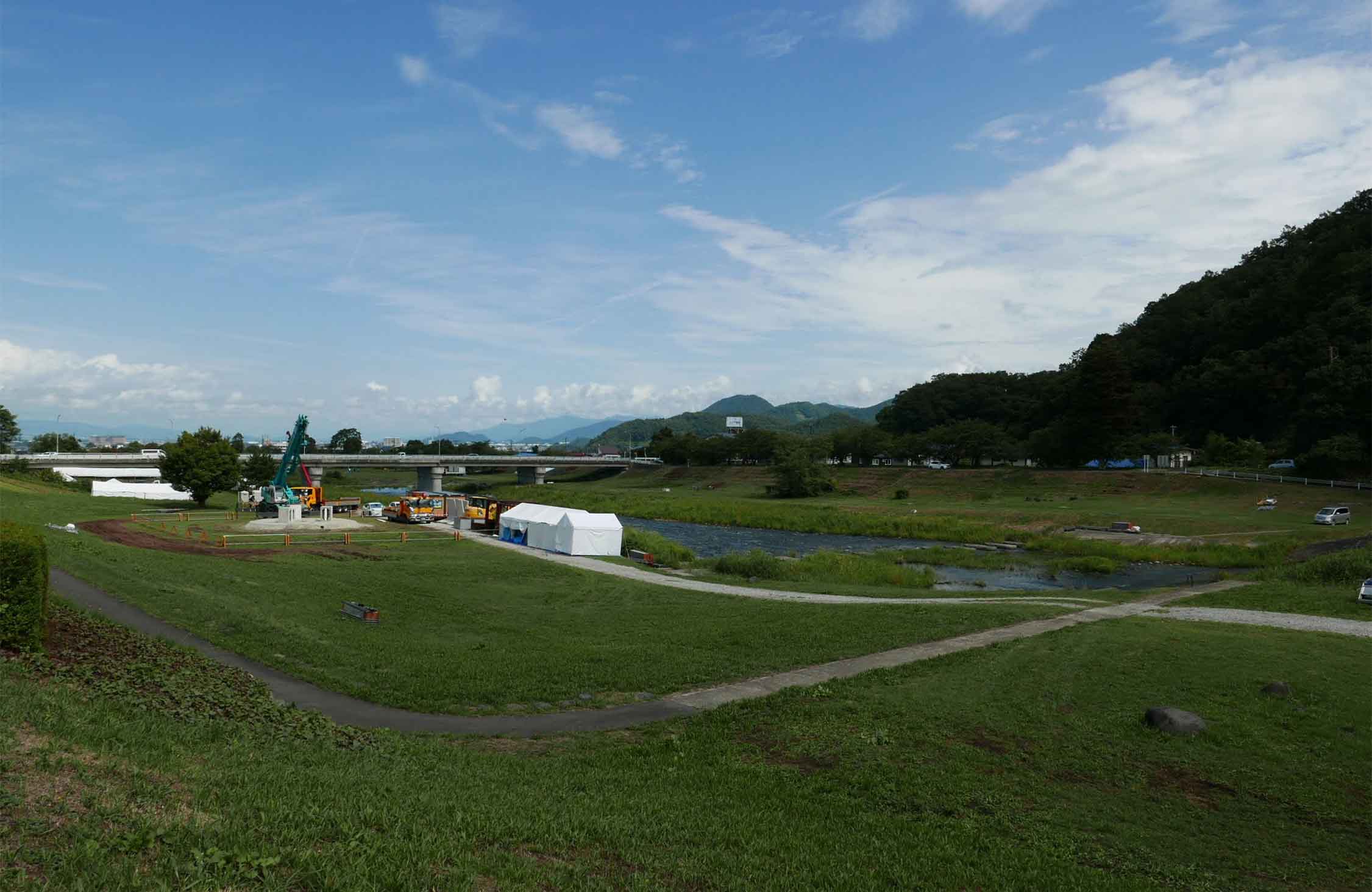 スーパーで「芋煮セット」を注文し、 大鍋や薪、食材を手分けして馬見ヶ崎川の河川敷へ運ぶ。