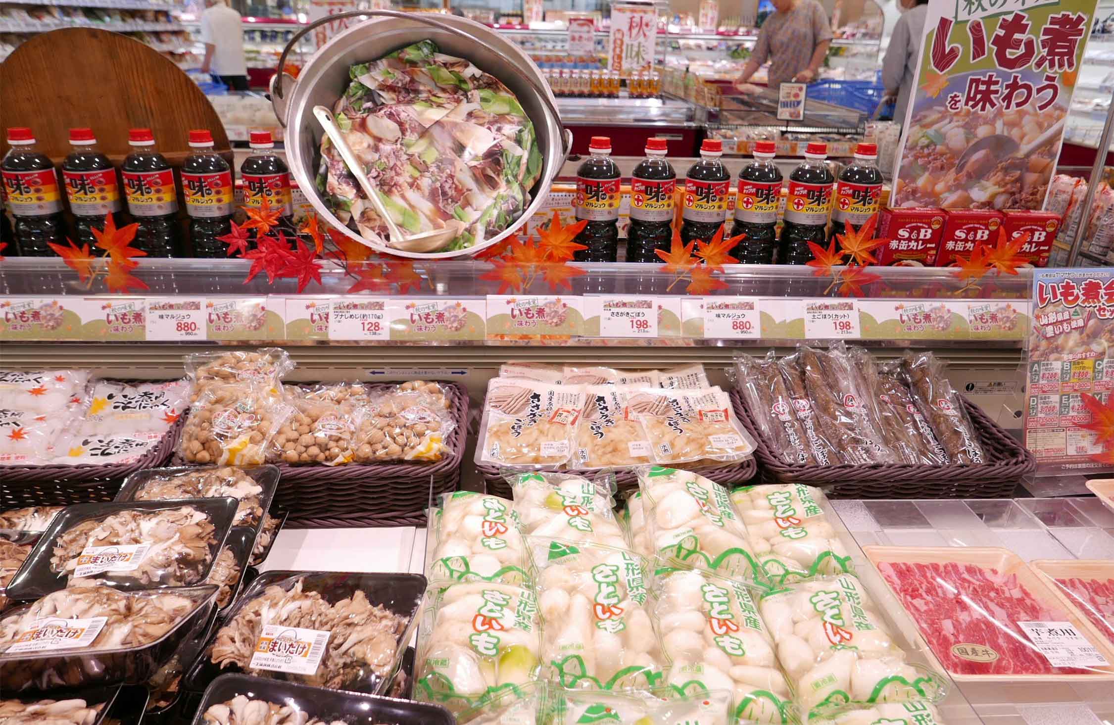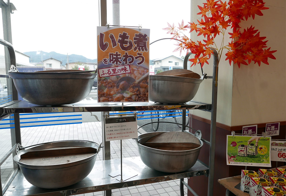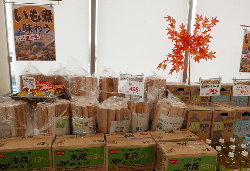 どこの店にも「芋煮コーナー」がある。里芋、こんにゃく、牛肉、ネギ、割り下のボトル。「鍋貸し出します!」のポップの横には、薪が高く積まれている。