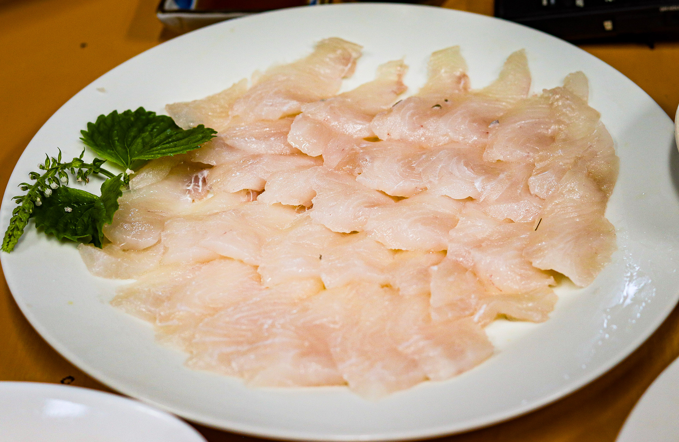 「これは、能登フグの炙りね。ポン酢で食べてください。お好みで一味かけるとおいしいよ。ここのフグは下関よりも生産量が多いんですよ」