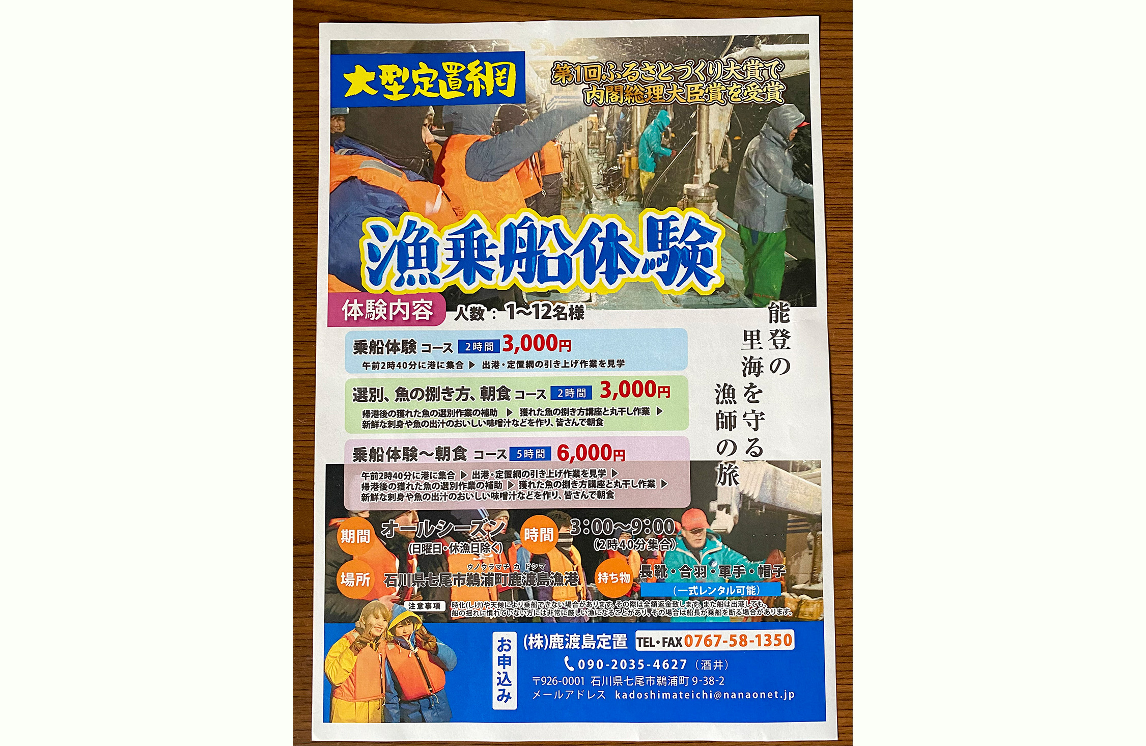 一般客を乗船させるため、通常の小型船舶操縦士免許に加えて「特定操縦免許」も取得。この免許がなければ観光客を船に乗せることができない。現在、七尾市で一般向け乗船体験を提供できるのは鹿渡島定置のみだ。……ということは、私が目の当たりにした海の男たちのプロフェッショナルな仕事の流儀も、この体験でしか味わえない。そう思うと、船上でガツンと注意されたことも貴重な気がして嬉しくなる。