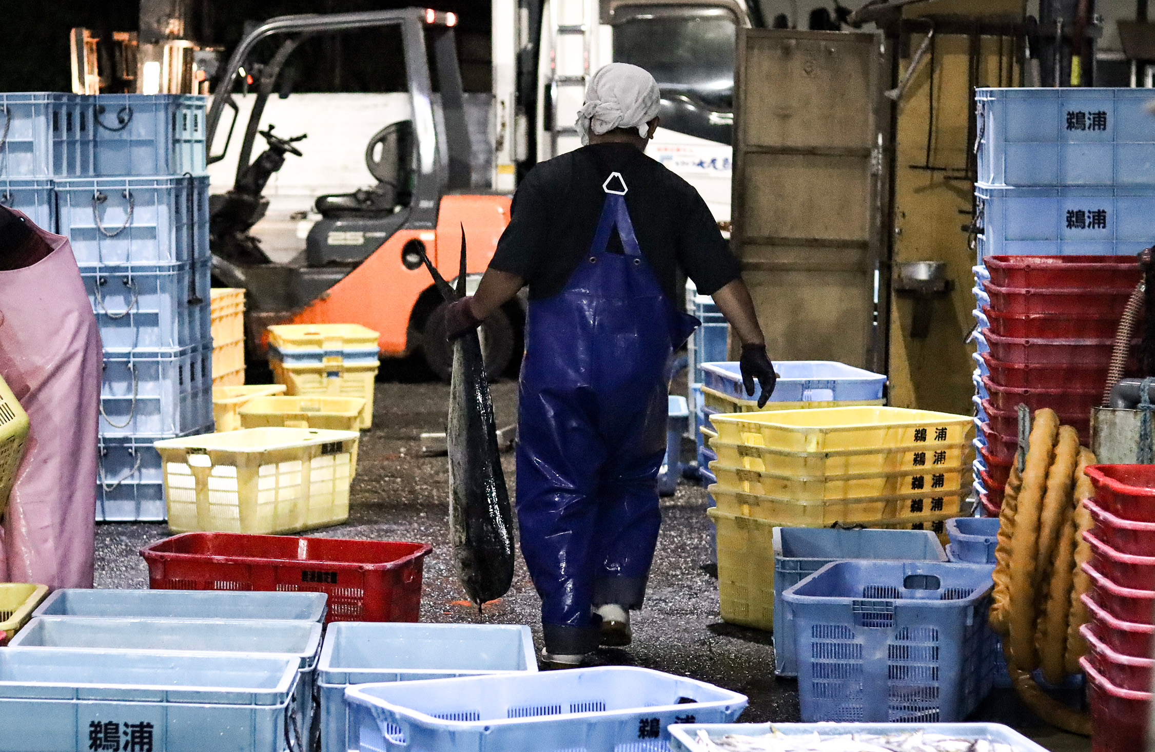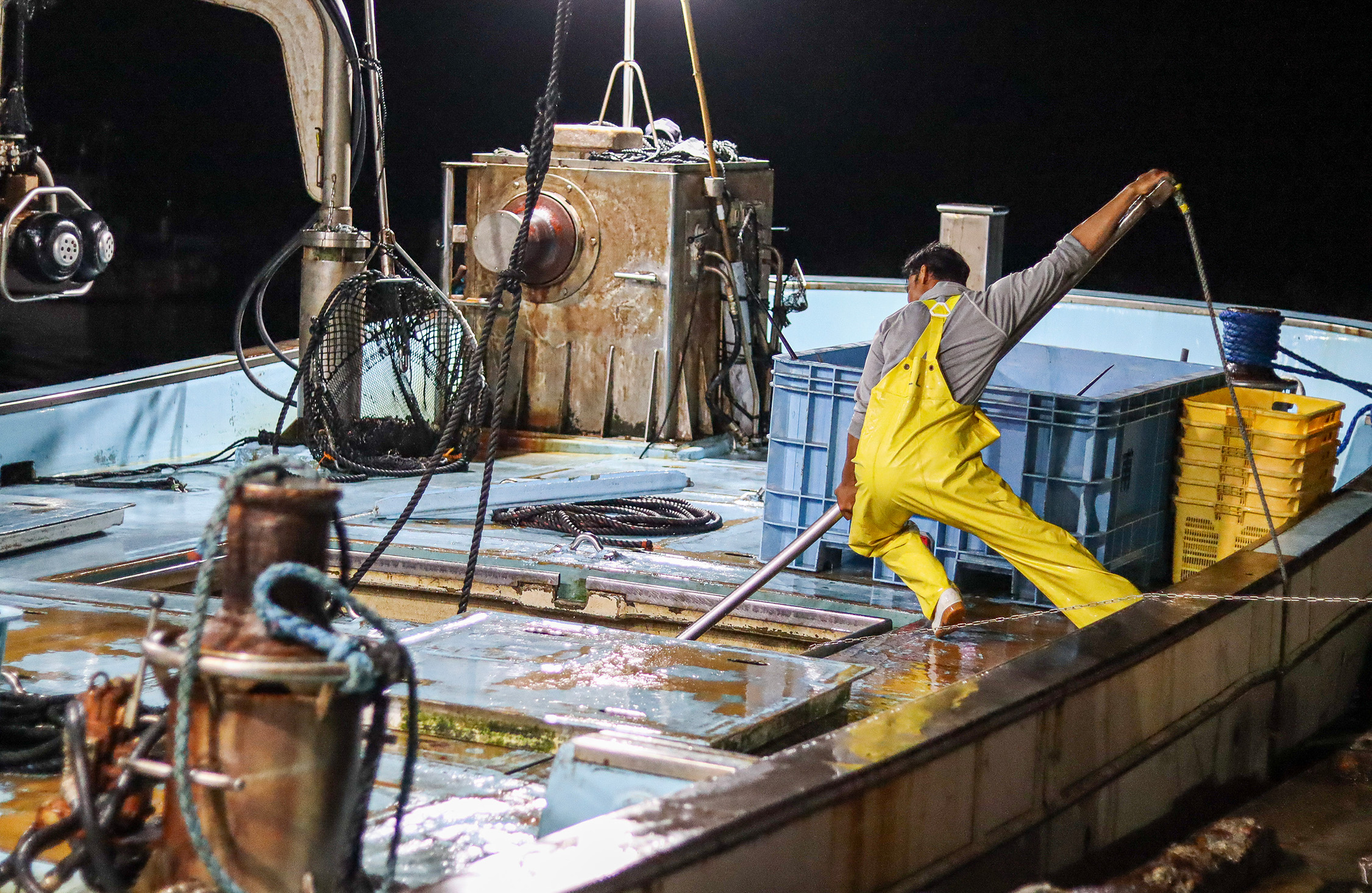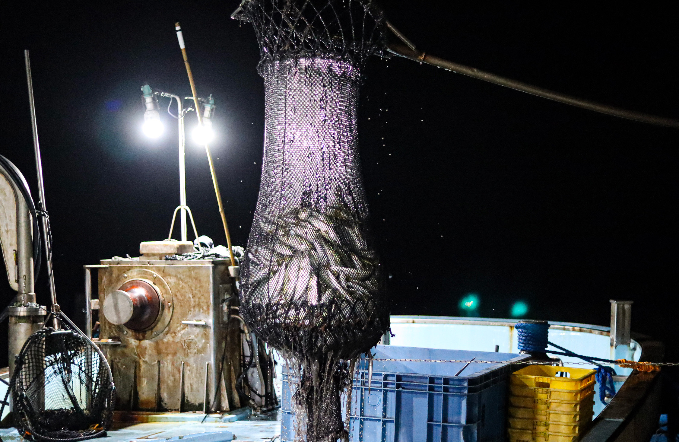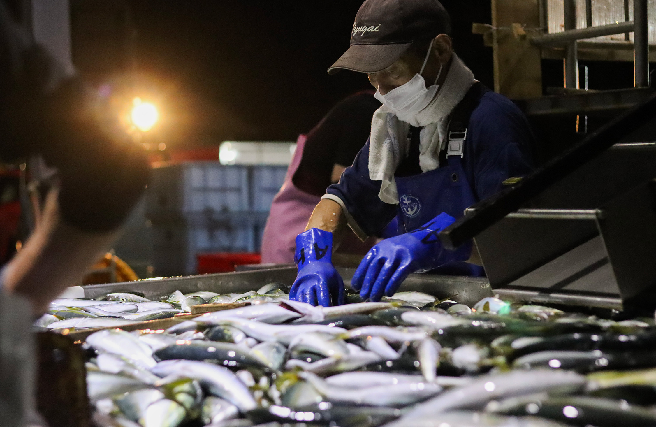 午前4時20分。漁を終えて港に戻ると、仕分け作業が始まる。
