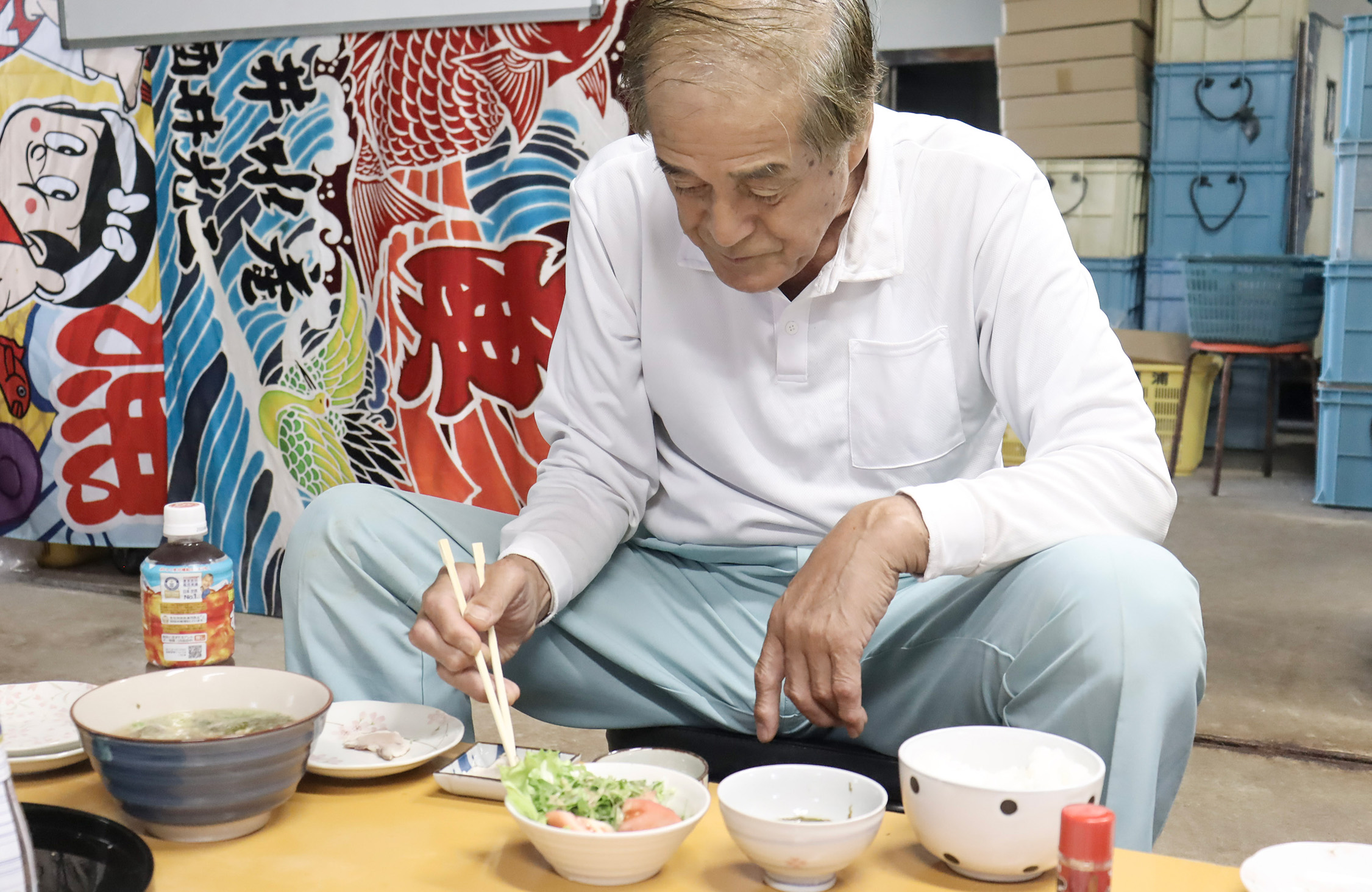 2日後、母を誘って再び鹿渡島定置を訪れた。酒井社長が迎えてくれる。先日、食べ逃した朝の漁師メシをなんとしても体験したくて、社長にムリを聞いてもらったのだ。