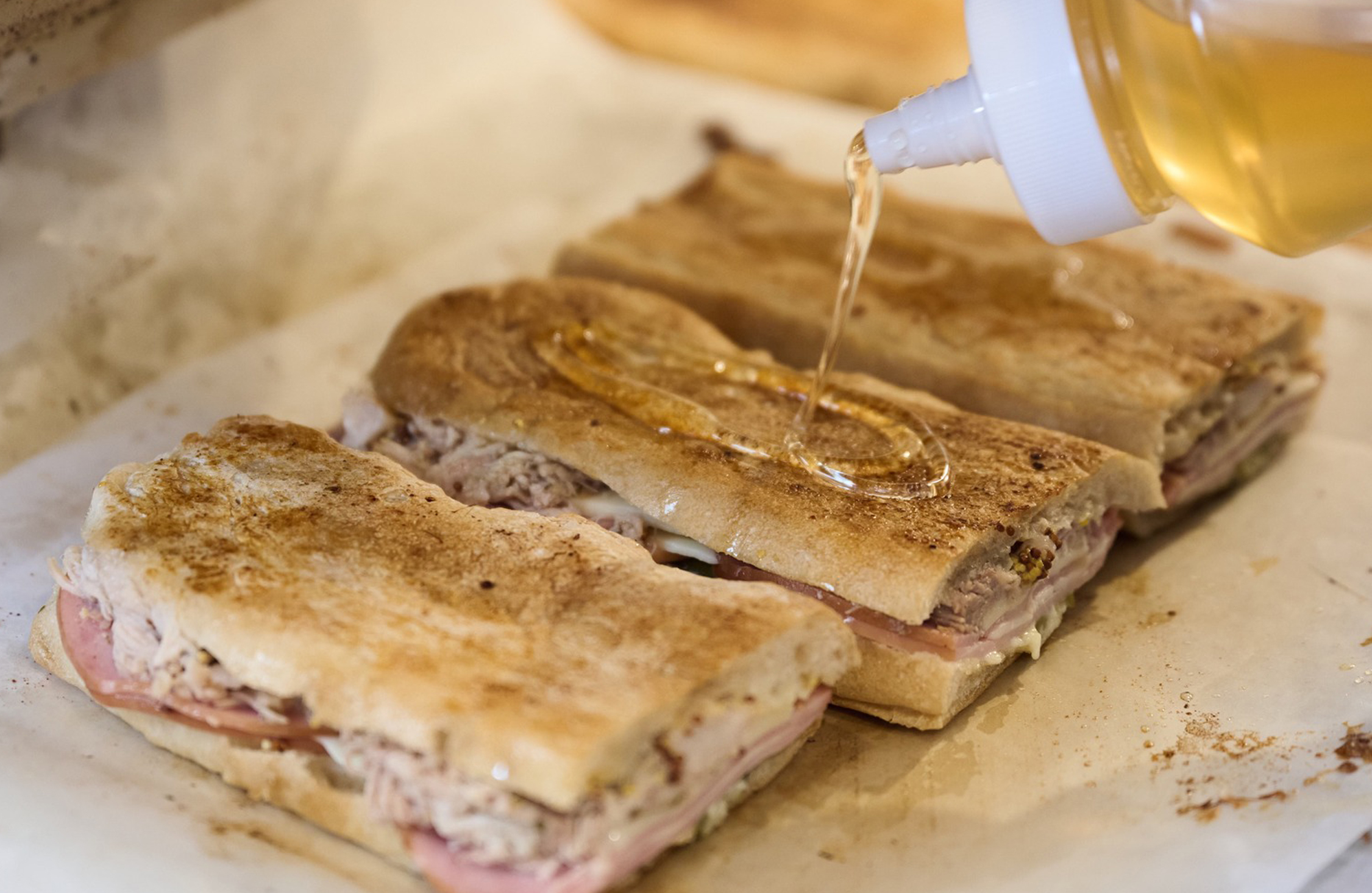 この蜂蜜が抜群に利いている。プレスされてカリっと焼けたパンにかぶりついた時、口のなかに拡がる爽やかな甘みが、ほかの具材の酸味、辛み、旨みを柔らかに包み込み、どちらかと言えばワイルドな風味のキューバサンドを華やかに仕立て上げているのだ。これが、「地元のおじいさん、おばあさんも買いにくる」という人気の秘密だろう。