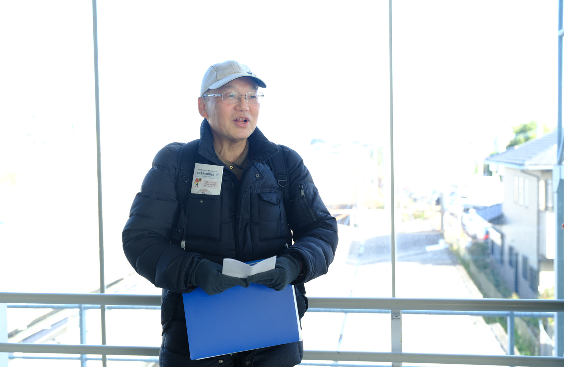 今はもうない電車を想像しながら線路跡を歩くことで、何か見えてくるものがあるかもしれない。今回は正木さんと共に、ジオネット日立の田上正敏さんら3名のほか、日立でまちづくりに関わるみなさんにも参加してもらい、鉱山電車の起点から終点までを一日かけて歩くことにした。