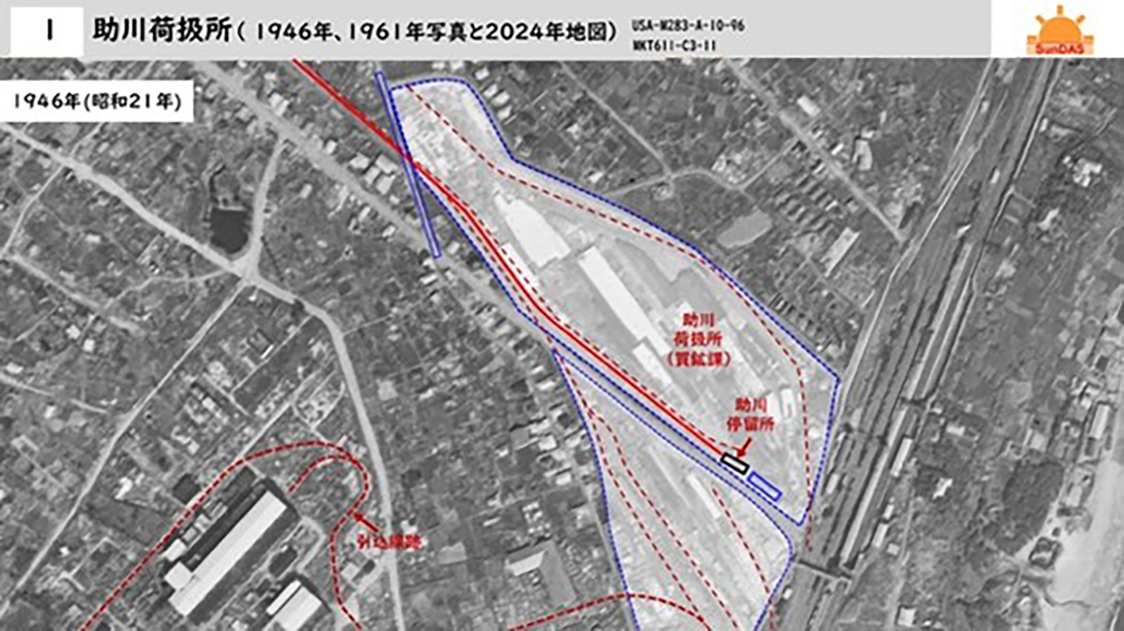 正木さんの線路跡の推定方法はこうだ。資料として国土地理院地図と、国土地理院の1946年と1961年の空中写真を利用。まず地図に道路、建物は緑、川は青というように照合マーカーをつける。正木さんによれば「古く細い道路は移動することなく、そのまま残っていることが多く、位置特定に有効なのです」とのこと。