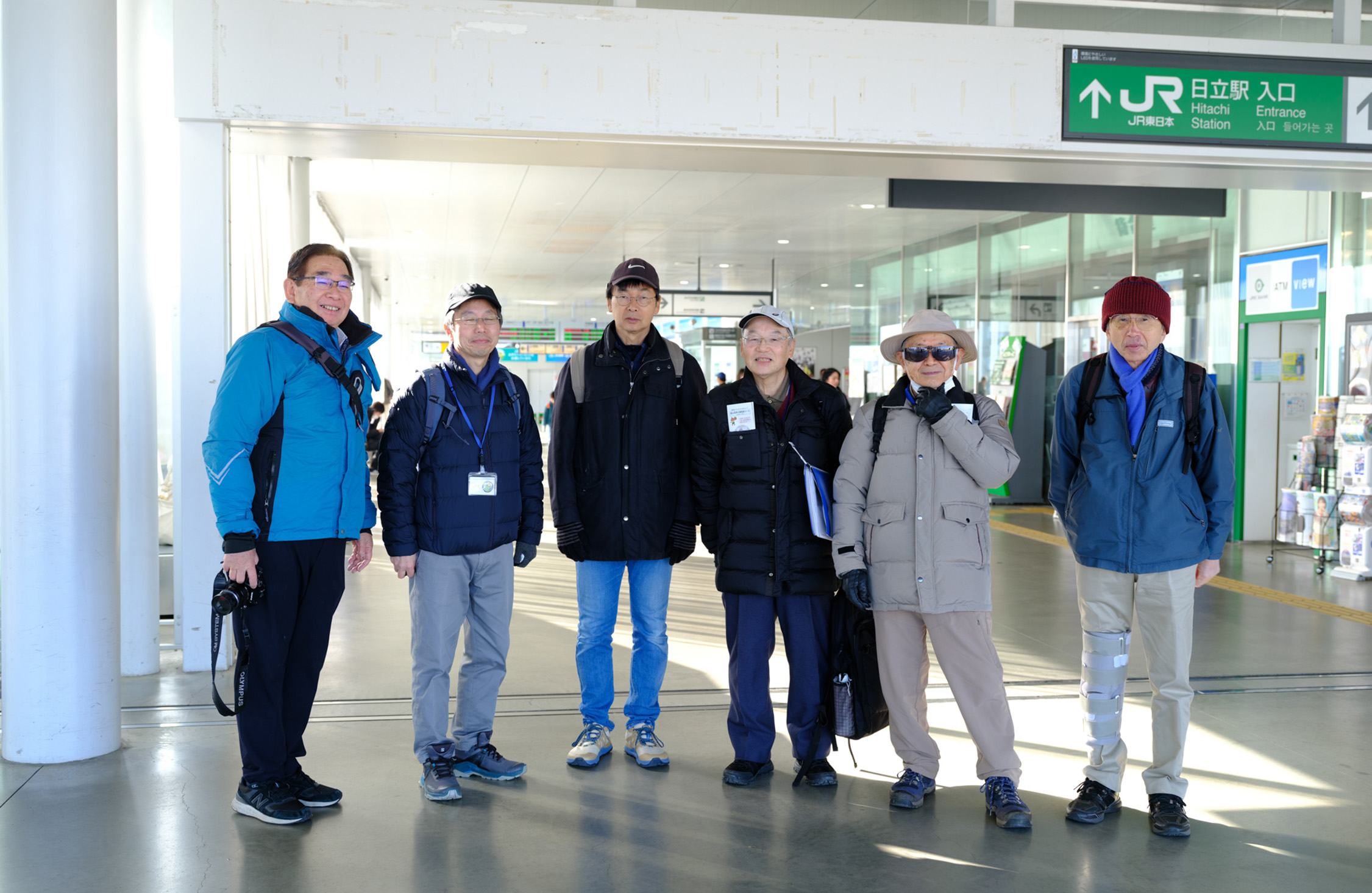 日立駅改札前から出発だ!地質学者の田切美智雄さん(右から二人目)、街づくりにかかわる井手よしひろさん(左から一人目)らもいっしょに。