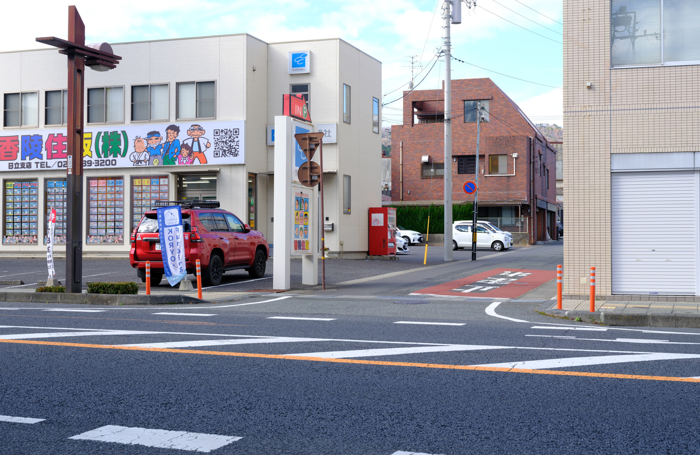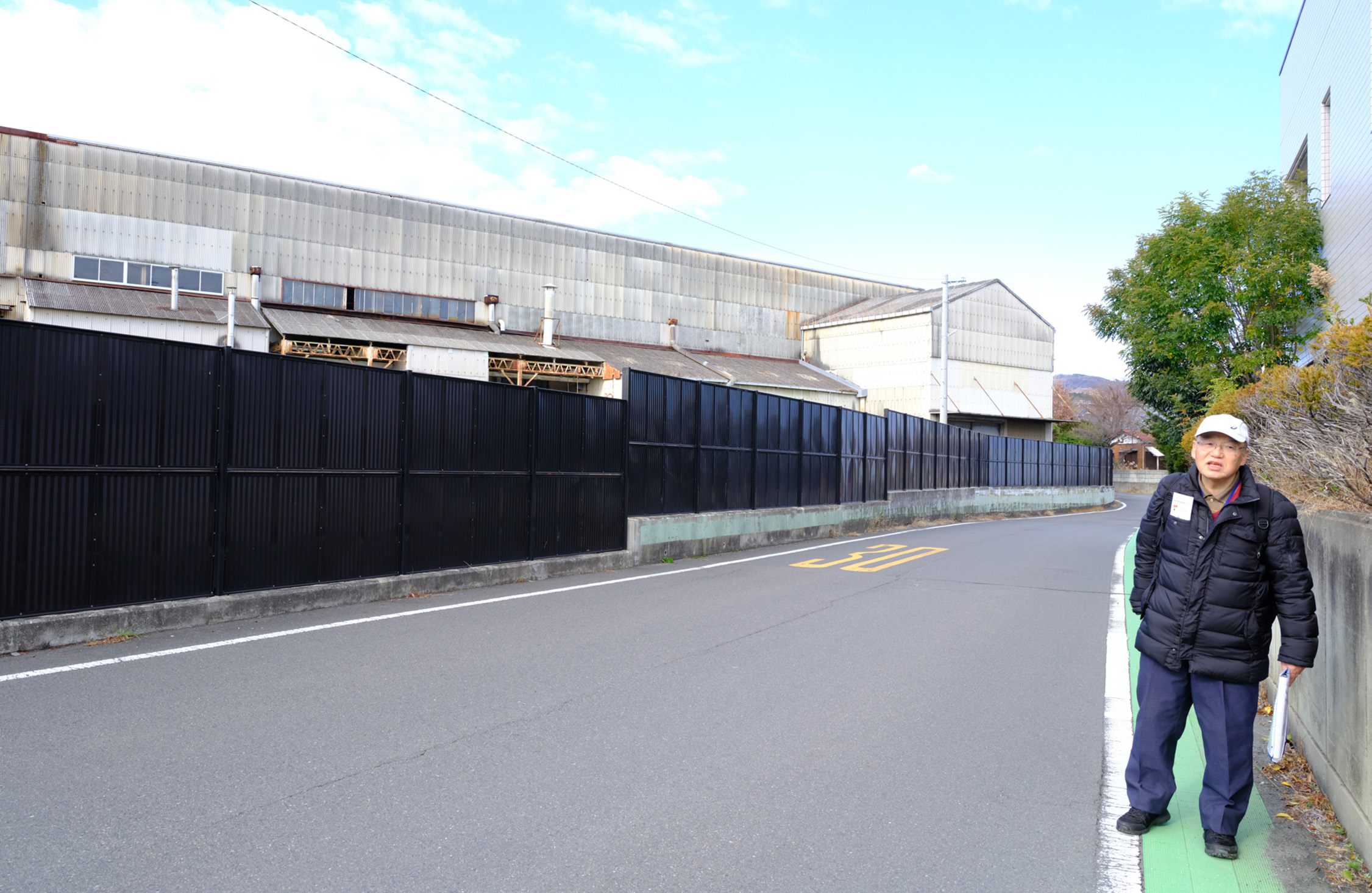 6号国道に出た。ここが6号国道踏切跡だ。起点となる日立駅前からここまで約2キロの線路跡を歩いてきたことになる。渡ってさらに進むと、すぐに大きな工場の前に辿り着いた。地元の人たちからは「電線工場」と呼ばれている。電線工場の外周に沿って、線路跡はここで大きくカーブを描き、北上する。当時は工場内への引き込み線もあったという。
