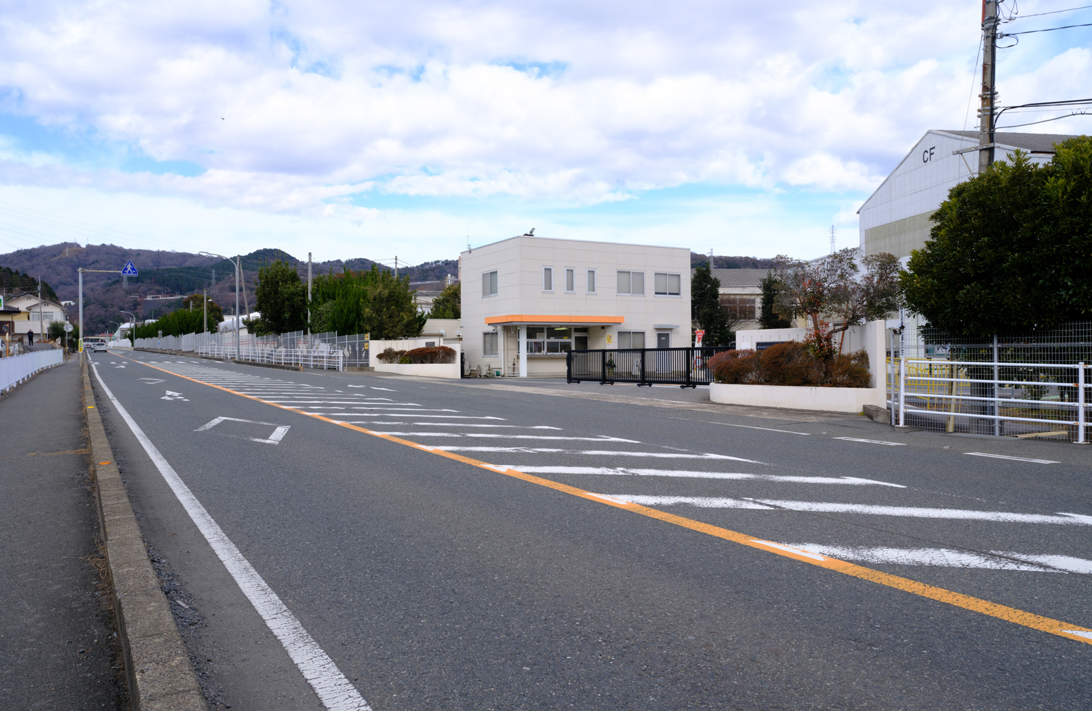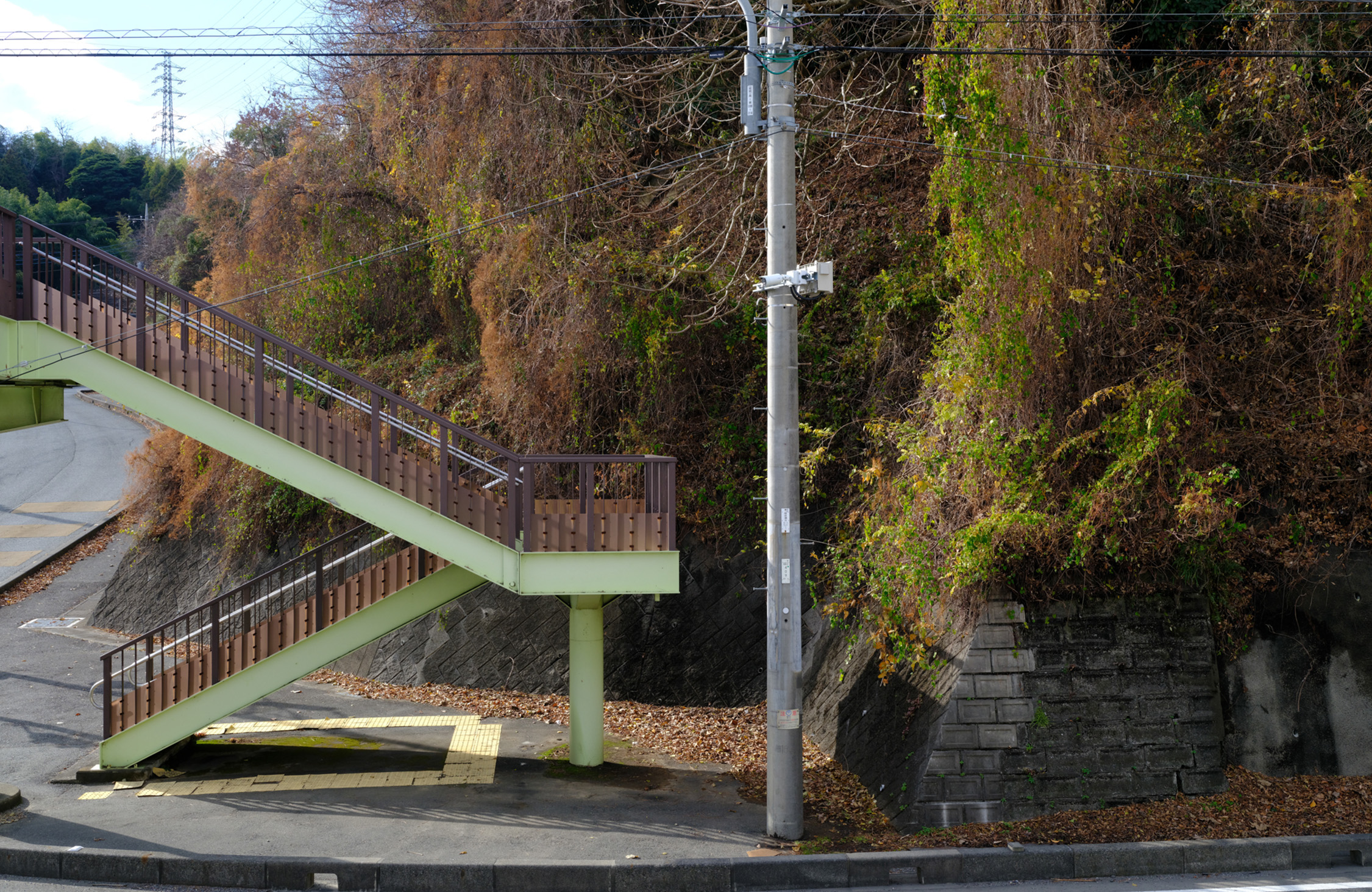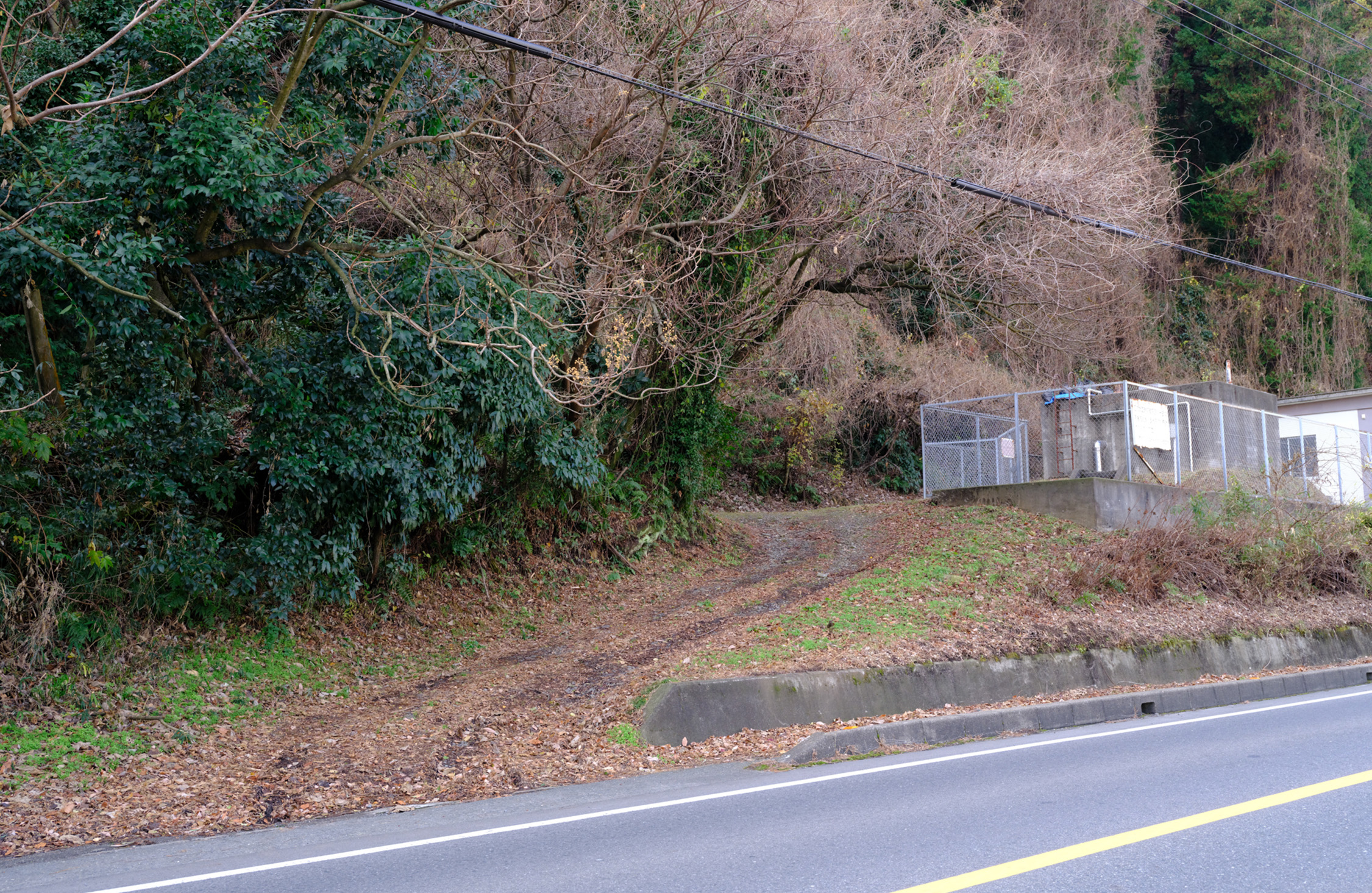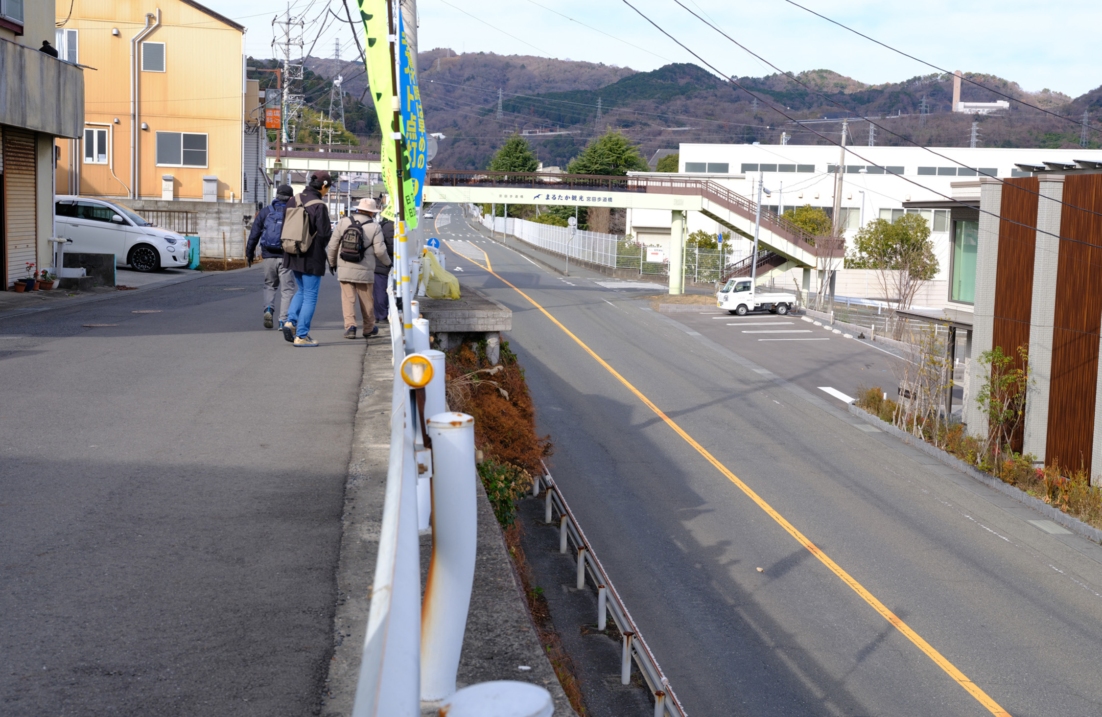 山手工場をあとに、県道36号を進む。すぐ左手に現れる歩道橋を渡る。その後にすぐまた、線路跡が見えてくる。
