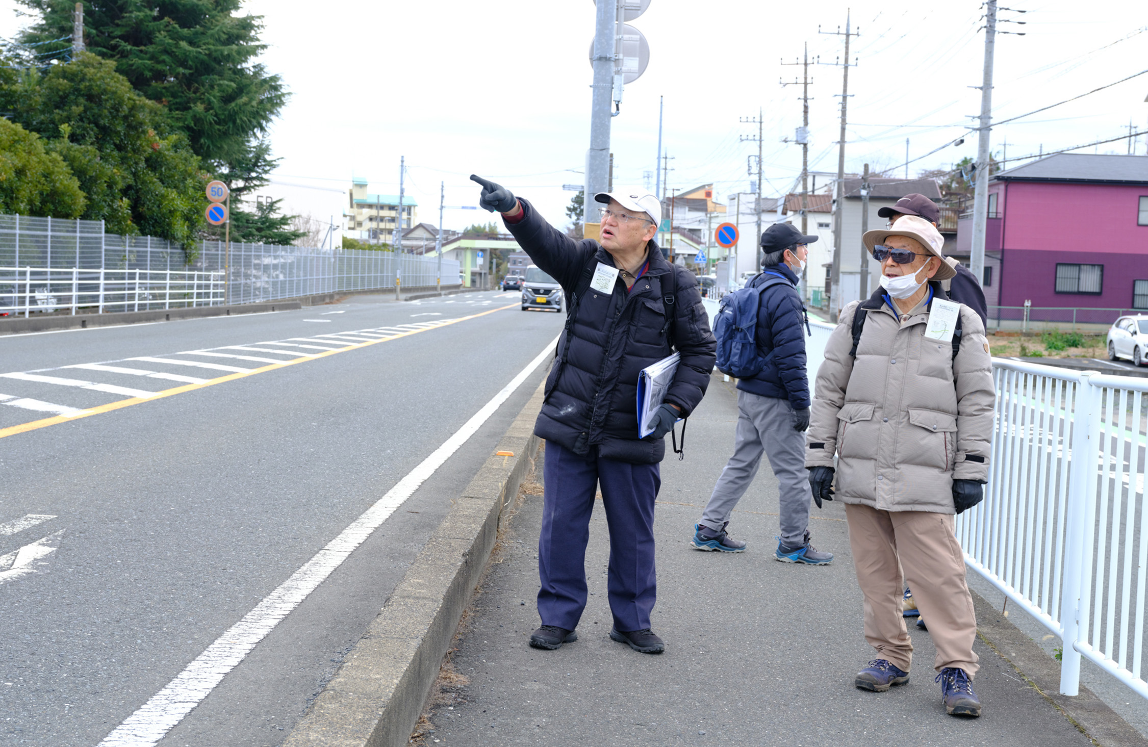 「当時の線路は歩道橋の踊り場と同じくらいの高さがあったでしょうね、かなり高い」と田切先生が、正木さんと位置を確認し合う。左手に続く、道路よりずっと高い位置にある線路跡は藪の中に埋もれてしまっている。それを見ながら私たちはさらに進んでいった。
