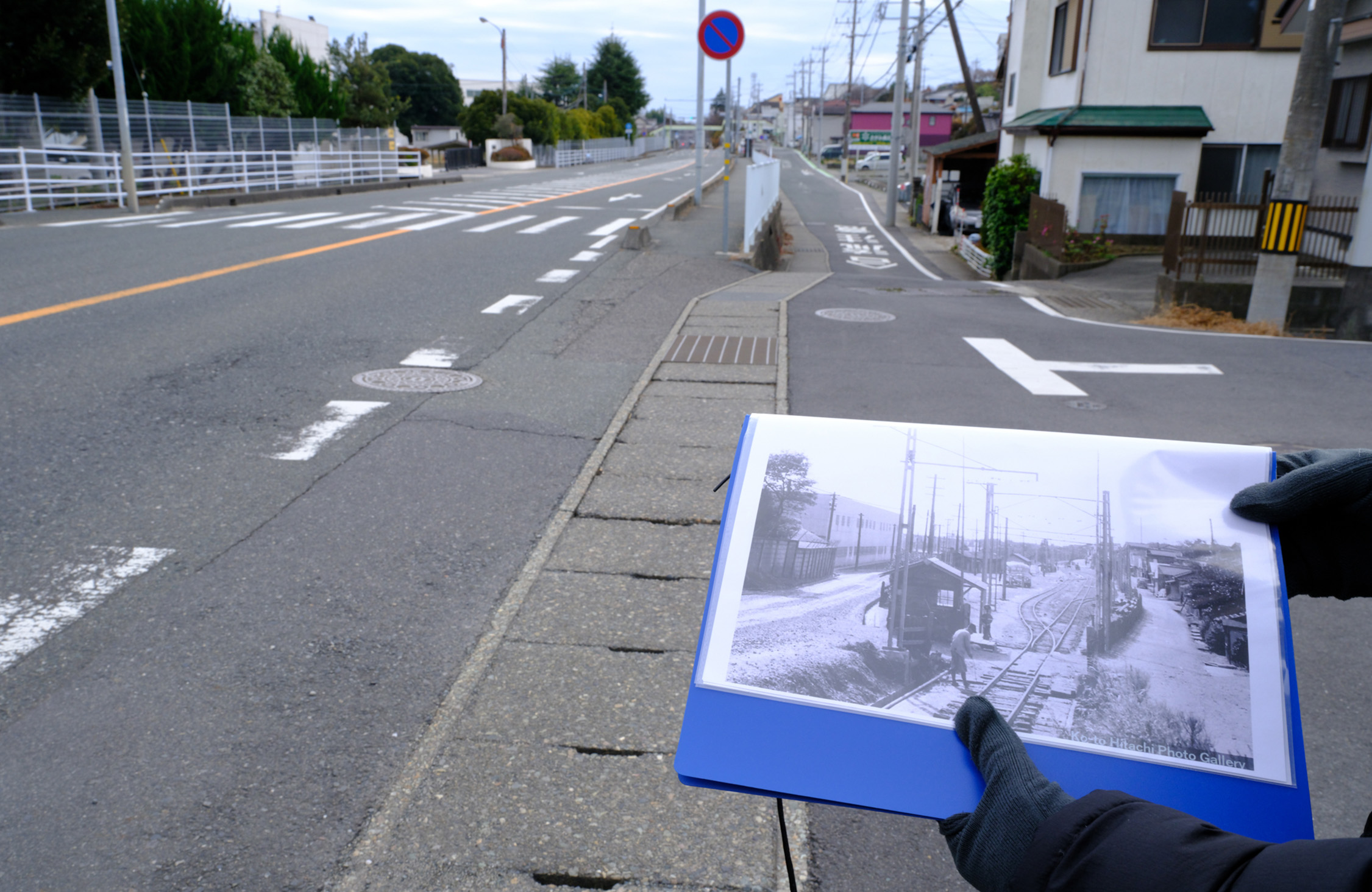 ここでも立ち止まって、正木さんや田切先生とともに、資料の古写真と現在の道路の位置関係を確認しながら、軌道跡を推測する。