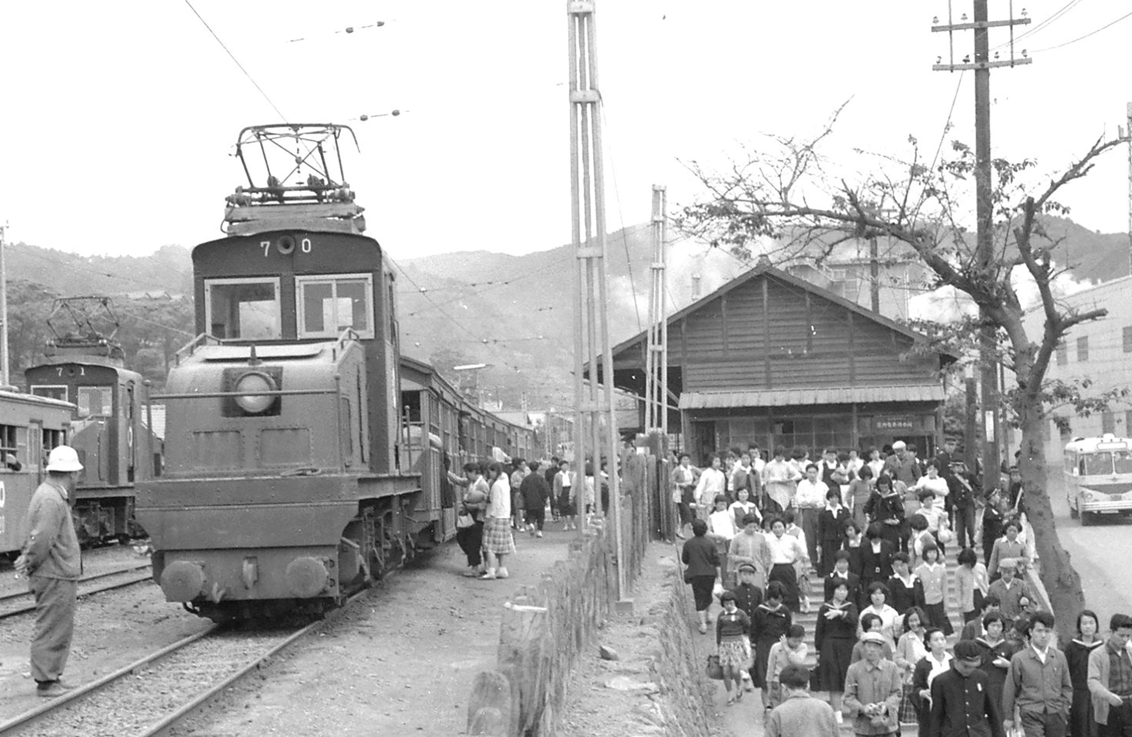 芝内停留所は、町の人々からはいまも「山手工場」と呼ばれる大きな工場の前にあった停留所である。山手工場は1910 年から稼働する日立製作所の創業の地だ。助川停留所とともに、ここ芝内停留所も工場で働く人など、多くの人々が乗降した場所なのだ。線路は分岐し、構内に入る引き込み線もあったそうだ。