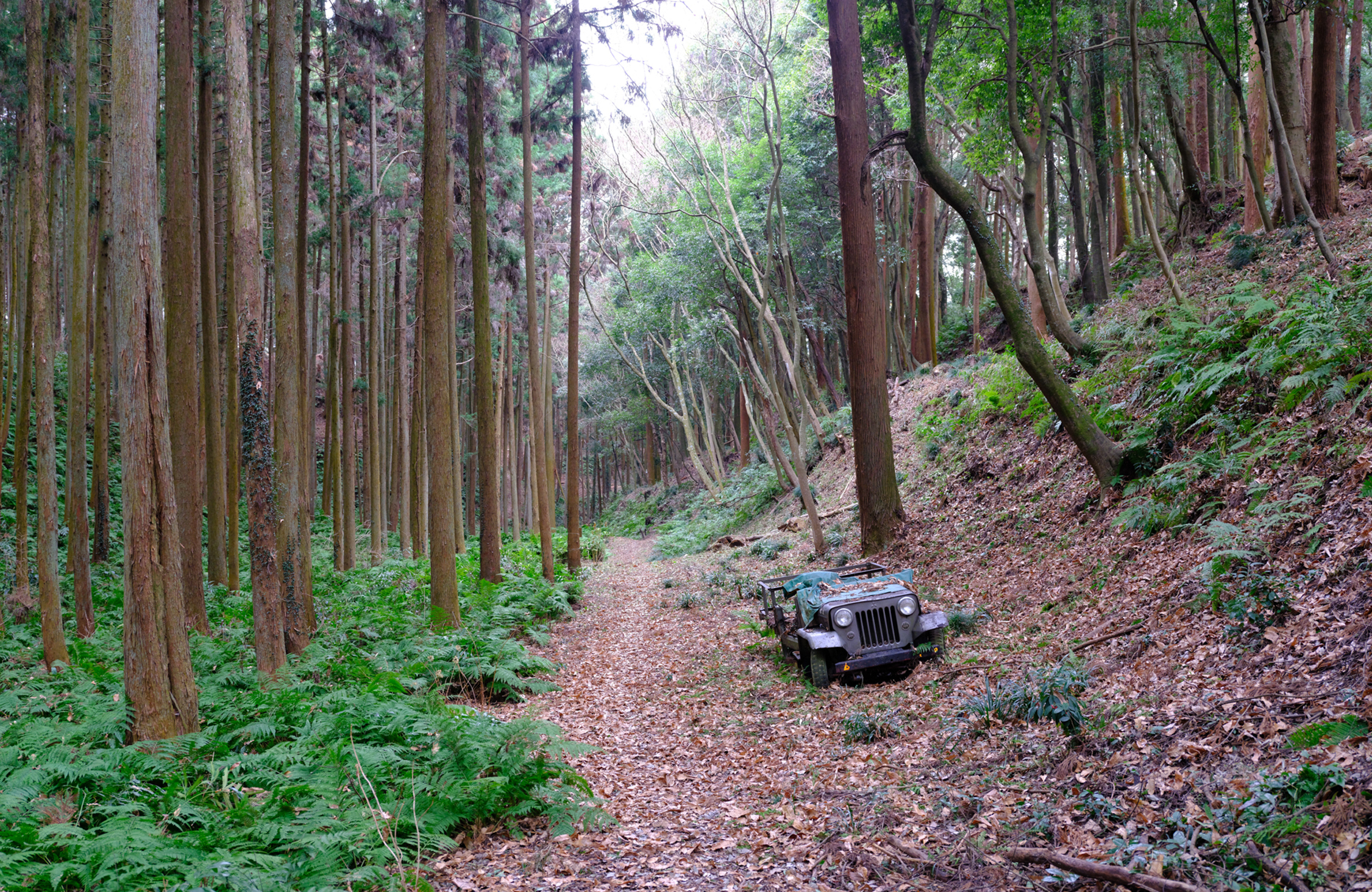 久米城名物、昭和の時代に廃棄されたジープの前を通り過ぎる。ファンの間では「まるでアニメ映画の世界のようだ!」と、フォトスポットとして有名なのだそう。