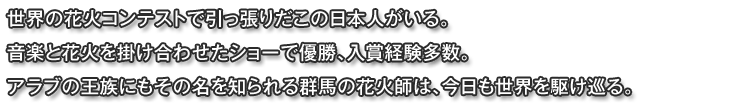 それまでにもドバイやカタールに呼ばれて花火を打ち上げてきた男は、はるばる日本まで来た王様の使者を眺めながらそう思った。