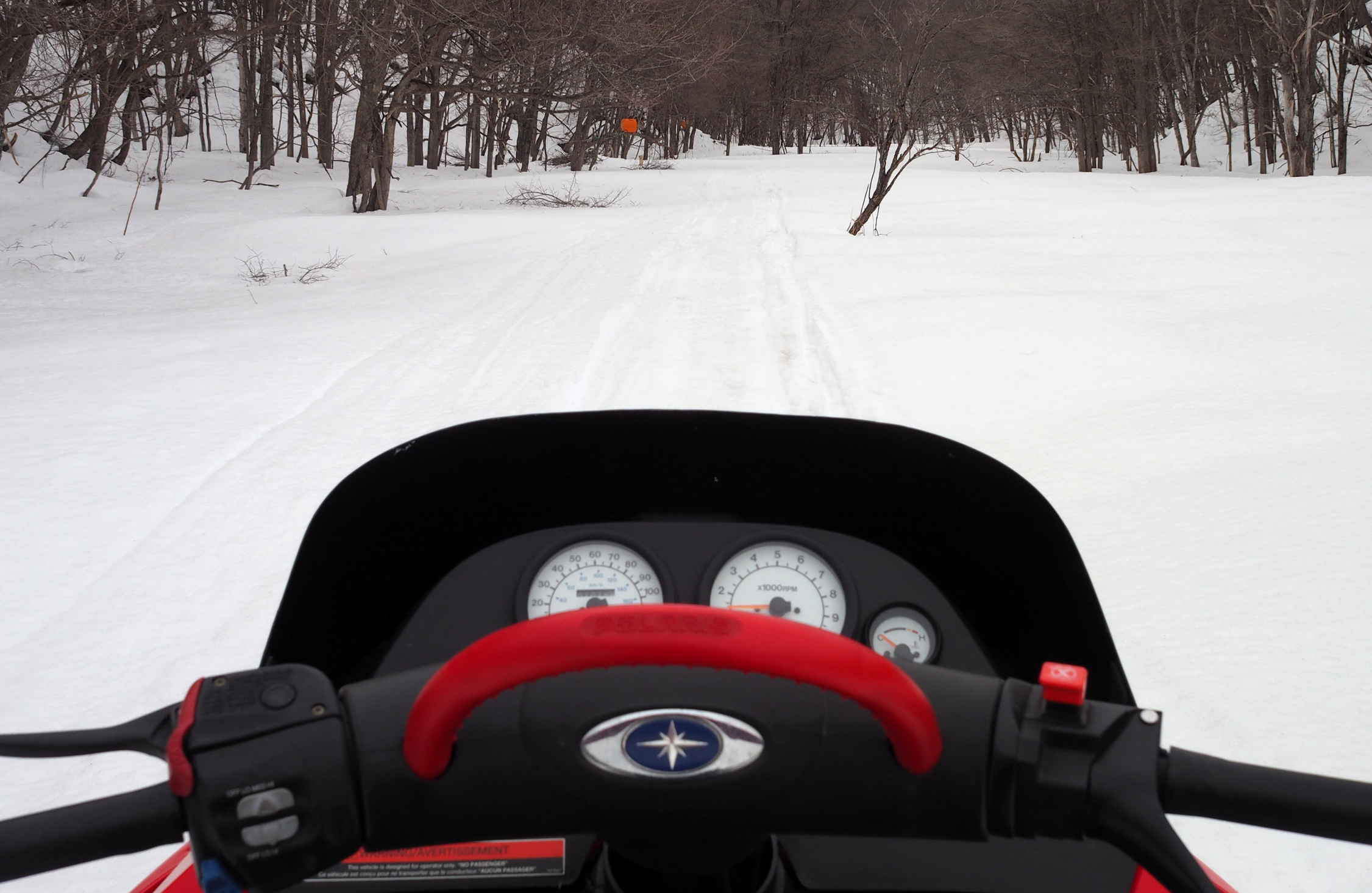 早速、ギャニオンさんが運転するスノーモービルの後ろに乗せてもらい、森へ。その日はそれほど寒くなくて、冷たい風が気持ちよく感じた。5分も走ると、目的地につく。