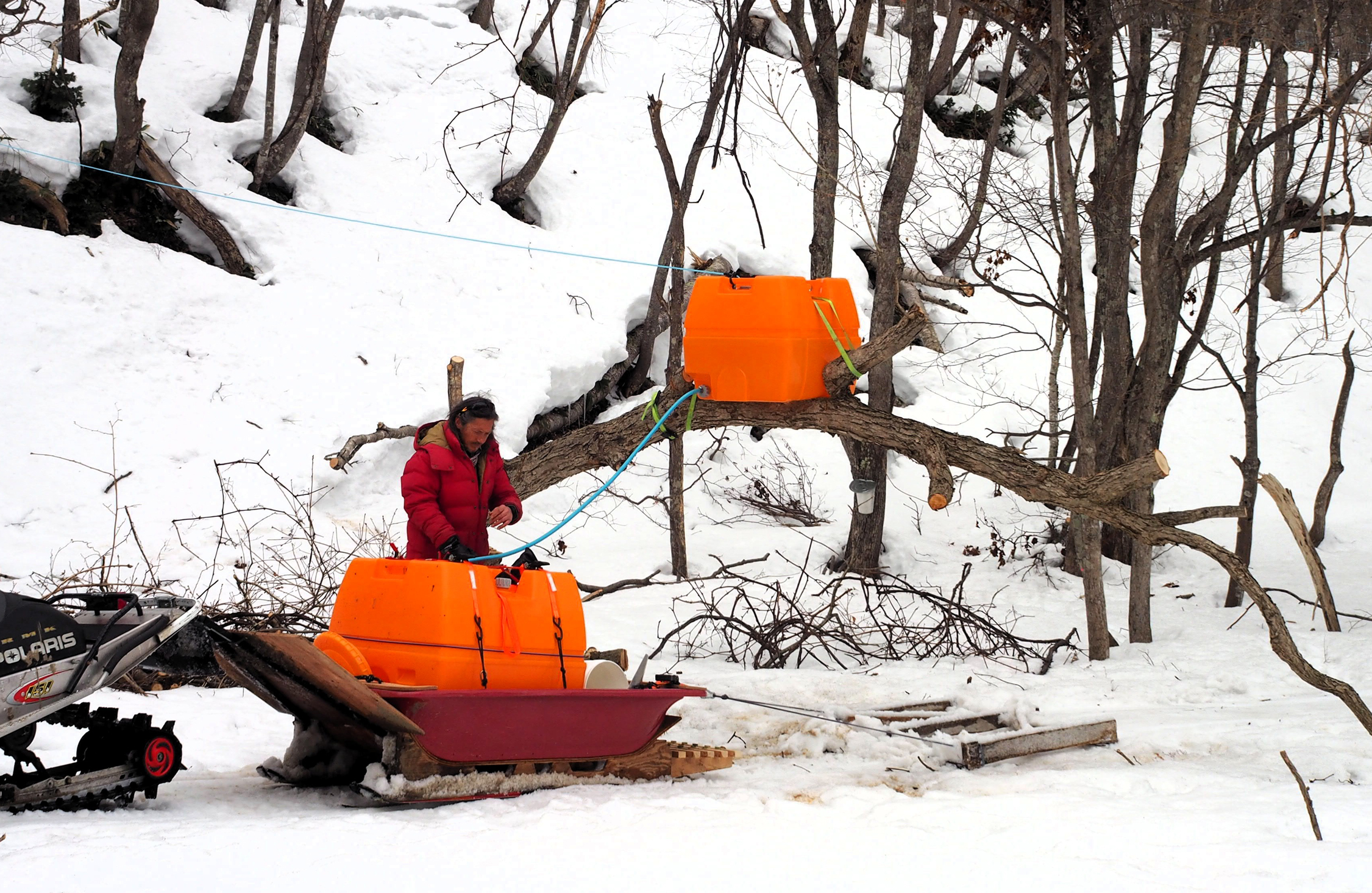 ギャニオンさんは午前中、2往復して2つのタンクに溜まった樹液を空のタンクに流し込み、それをシュガーハウスに設置した貯蔵タンクに移した。樹液は、無色透明無臭。これを煮詰めたらメープルシロップになると発見した人、すごくない?