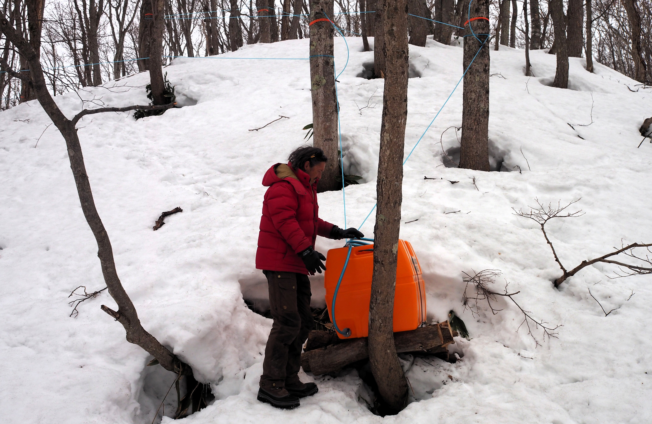 僕は2018年、秩父に生えているカエデでメープルシロップを作っているメープルベースの取材をしたことがあり、その際に樹液の採取方法を聞いていた。そこではカエデの樹にタップと呼ばれる蛇口を刺し、そこから流れ出る樹液をバケツで受ける方法で採取していた。その時は現場を見ることができず、写真で見せてもらっただけだったけど、それが主流の方法だと思っていたから、目の前の光景に驚いた。