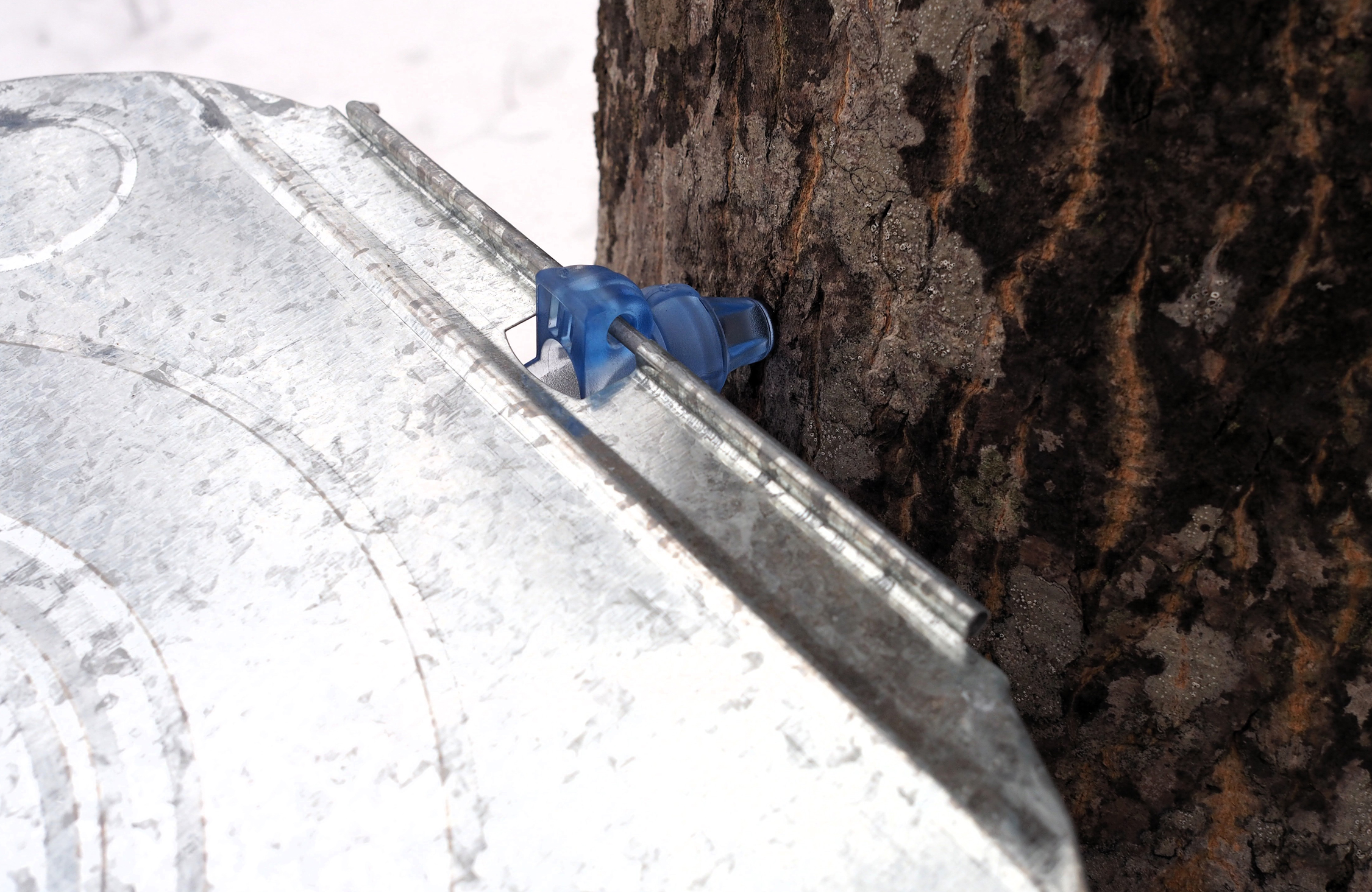 そして雪解けの時期になると、蓄えた糖分が根っこから吸い上げた水に溶けだす。これが春先にしか取れない「メープルウォーター」と言われる甘みのある水で、幹に穴を開けてこの樹液を採取するのだ。