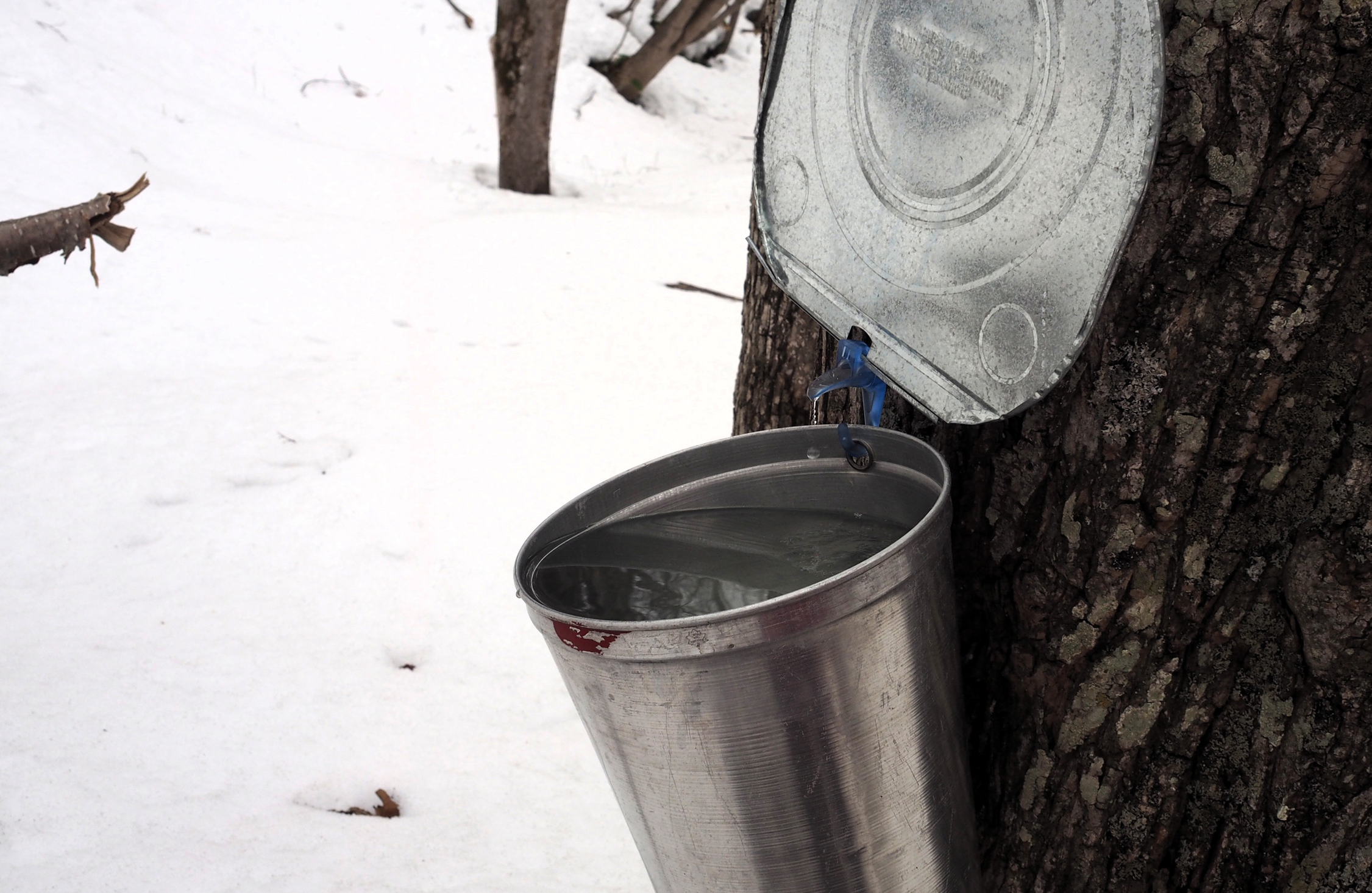 プラスチックのバケツの容量は20リットルで、単純計算すると満杯になったら20キロ。平坦な道を歩くとしても、20リットルの液体をバケツに入れて運ぶのは神経を使うだろう。それが、こちらは雪が積もった道なき山のなか。そのうえ、カエデは斜面に生えていて、スノーモービルまで上り坂だ。もし躓いたり、転んだりして樹液をこぼしたら、それは希少な商品をぶちまけたのと一緒……と思うと、怖くてバケツを満杯にはできない。3分の2ほど入れたら、スノーモービルを目指す。