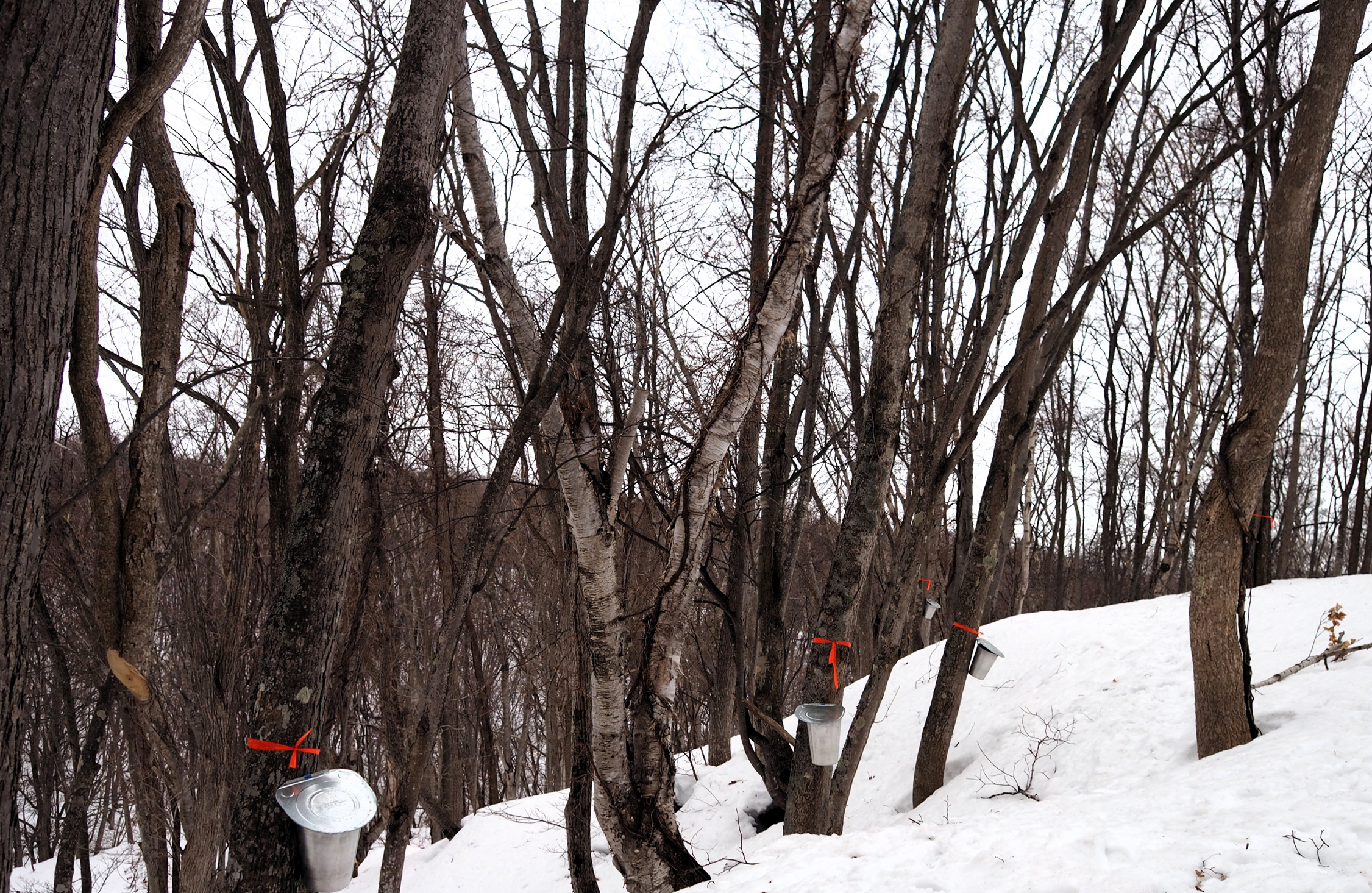 当別町の森では、チューブを付けているカエデはおよそ200本中の66本で、ほかは伝統的なタップ(蛇口)&バケツで樹液を採っている。金曜日の午後は、ギャニオンさんとバケツの回収に行った。その際にもうひとり、クラウドファンディングで支援して以来、ギャニオンさんと一緒に山に入って夏には草を刈り、木を倒し、冬になれば樹液の採取を手伝いに来るという青山さんも助っ人に加わった。