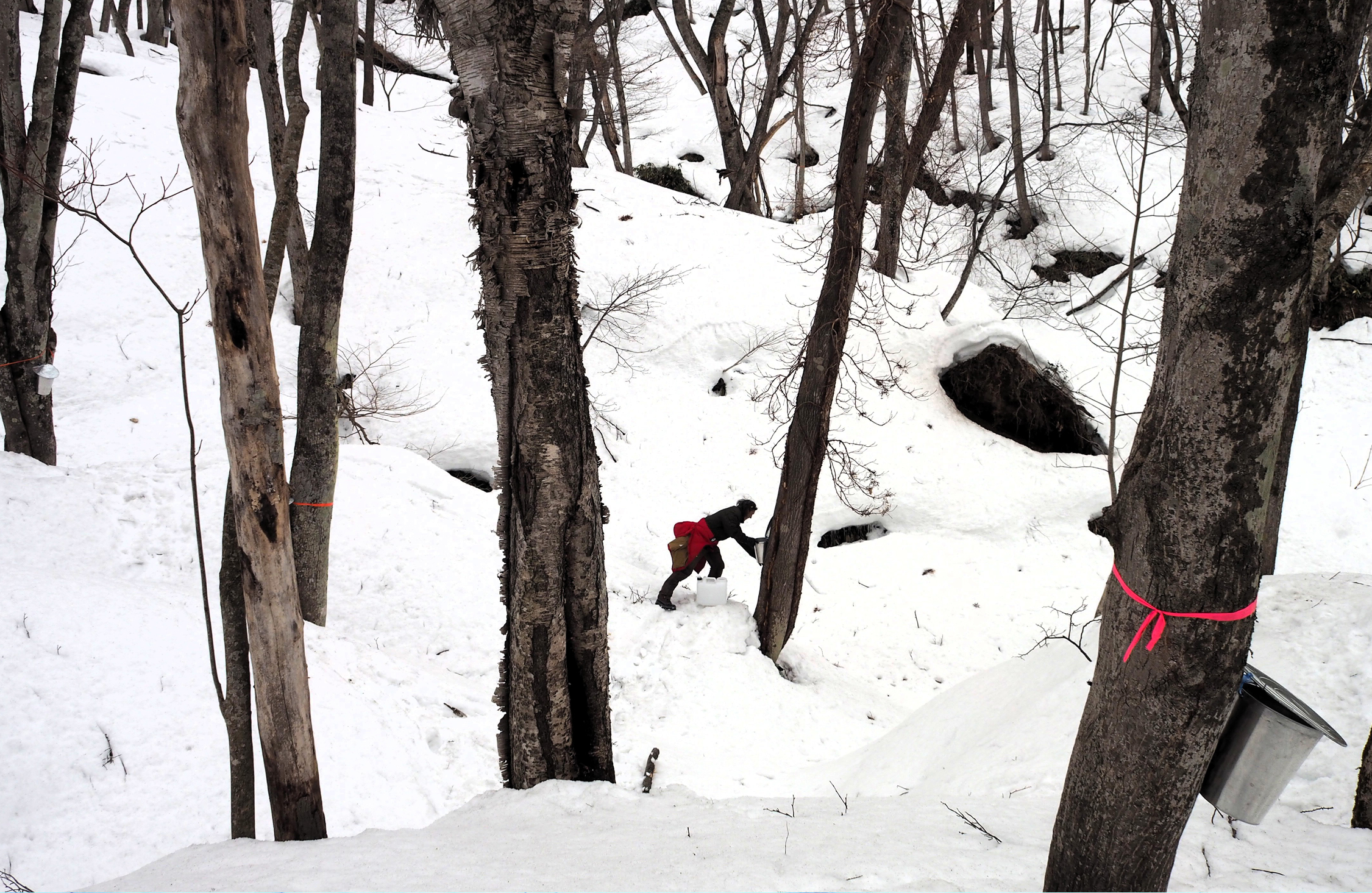 「来年、(チューブをつけるのは)100本にしたいです。でも、バケツも残します。タンクからタンクに樹液を移すだけ、面白くない。山でカエデとコンタクトするのが楽しいです。ここに来るお客さんも喜びます」