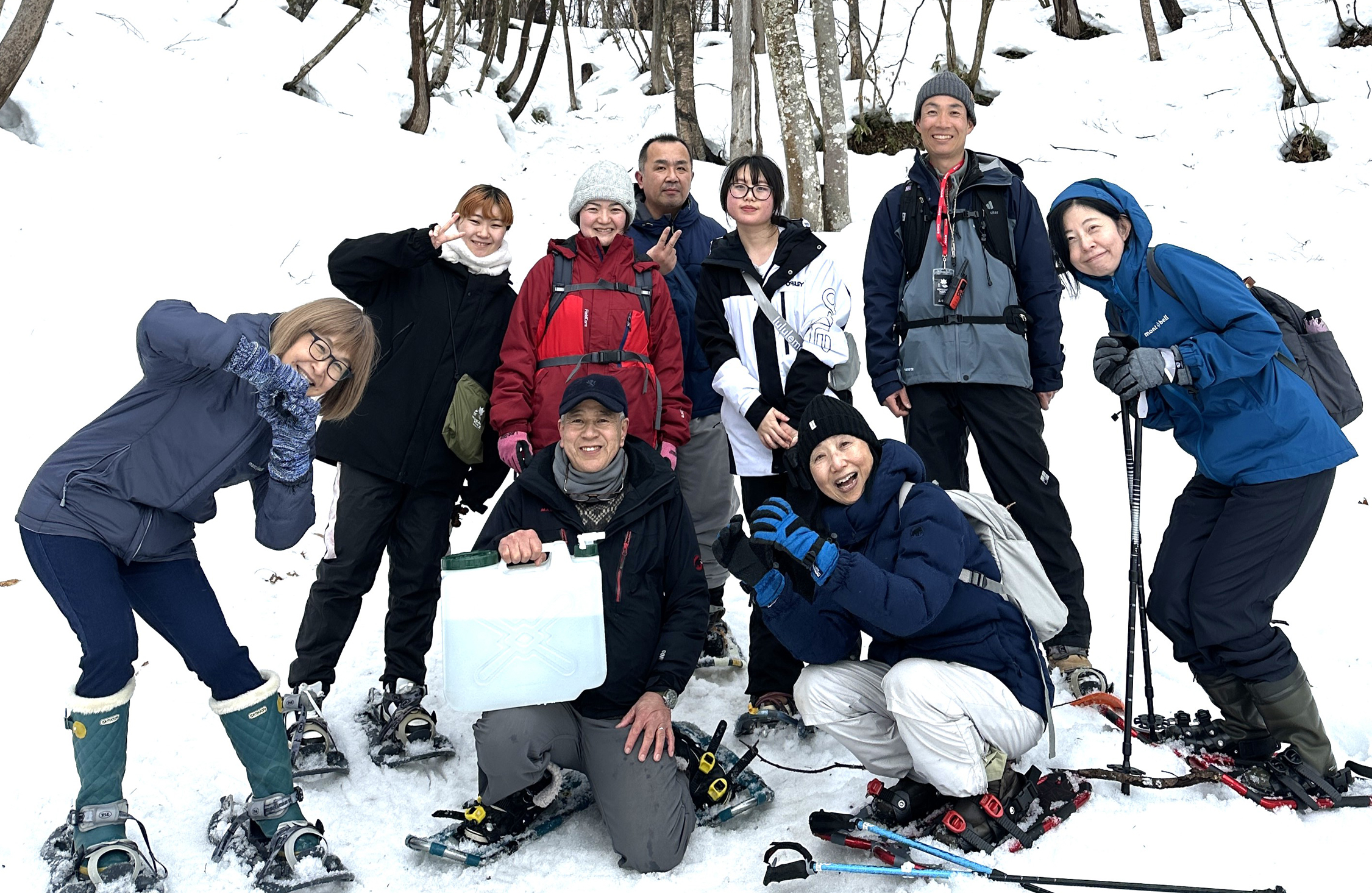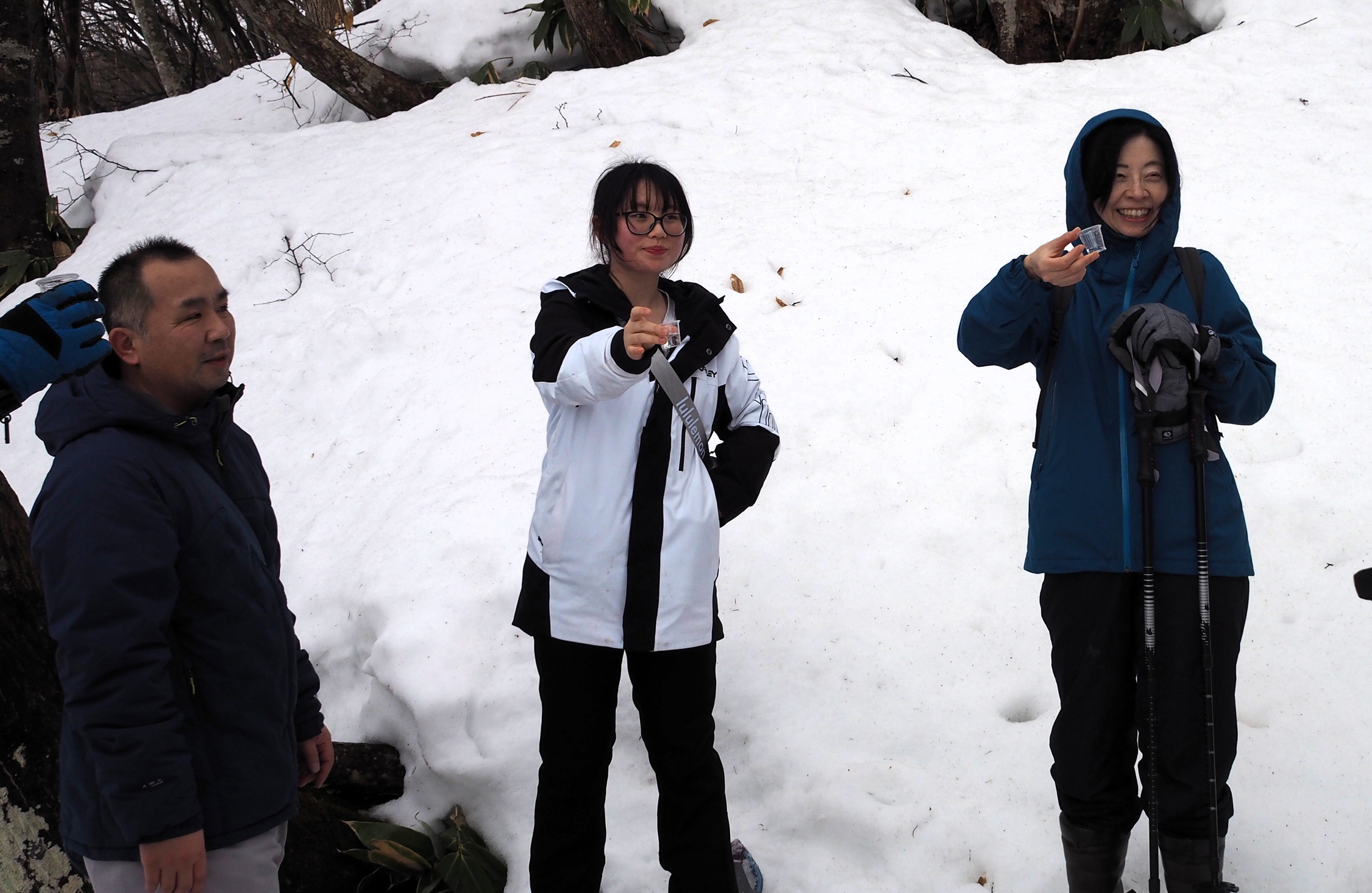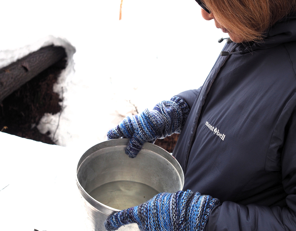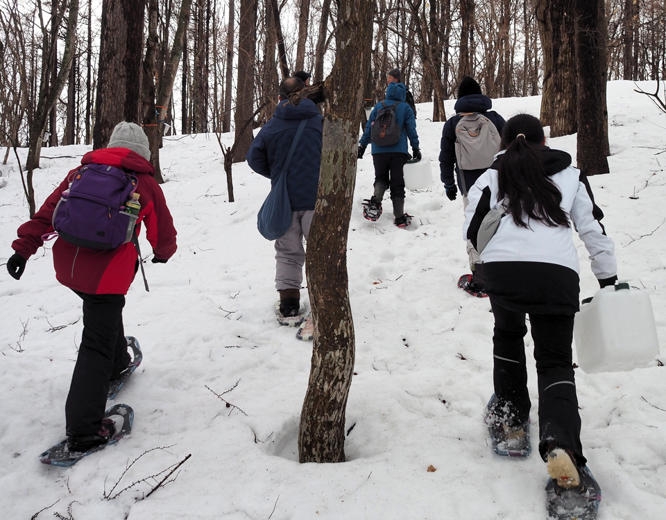 13時をまわった頃、メープルハウスから山まで約1キロ歩くところからスタート。スノーシューズを履いて、道なき道を行く。山についたら、プロジェクトメンバーからカエデやメープルシロップについて説明を受け、その後に樹液採取体験! 山の入り口に設置されていたバケツにたっぷりと樹液が入っていて、参加者から歓声が上がる。紙コップが配られて、その樹液で乾杯! メープルウォーターは普通の水よりもほんのり甘い。