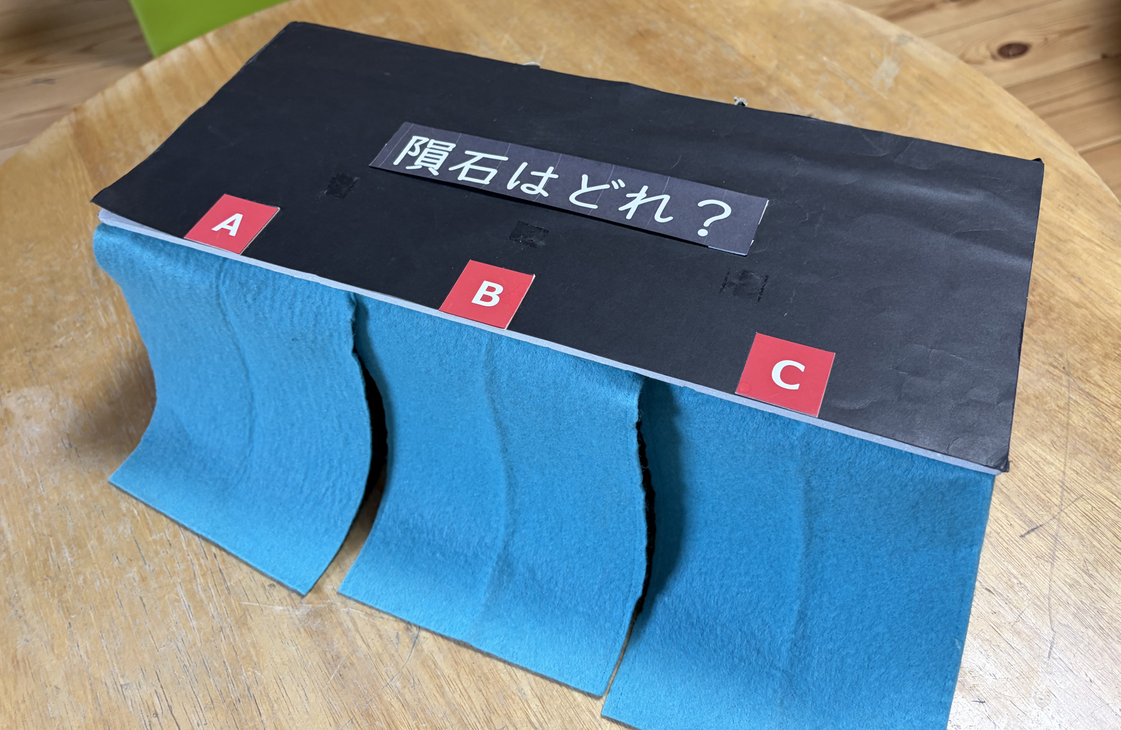私が最初に体験したのは、3つの固体から隕石はどれかを当てる展示だ。箱の中に隠された固体を触ってみる。隕石だと思ったのは真ん中だ。「なんで?」と山浦さんに聞かれ、「ザラザラしているから」と返す。すると、「隕石ってザラザラしているんですか?」と問われて、はっとした。隕石の表面は、どうなっているのだろう。