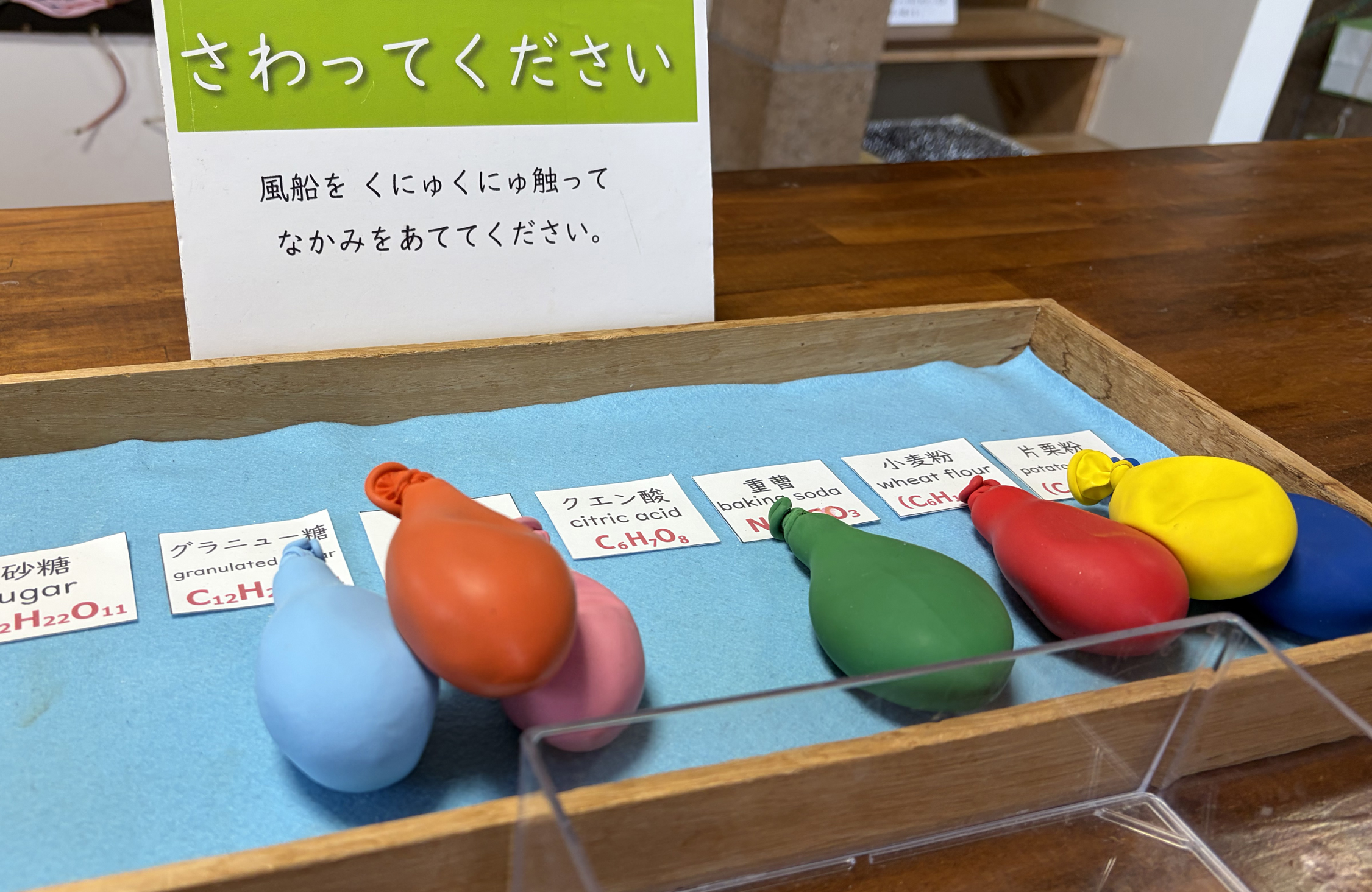 次は、カラフルな風船のなかにある粉の種類を当てる仕掛けだ。ザラっとしたイメージがあるグラニュー糖とキュキュッとした質感の片栗粉くらいはわかるだろうと思い、すべて触ってみた。しかし、まったくわからない。さすがに触っただけで全部わかる人はいないという。山浦さんは、こちらの反応を見ながら、頃合いを見てヒントを出してくれる。来館者がひとりで考えるのではなく、学芸員が隣で伴走してくれるのだ。