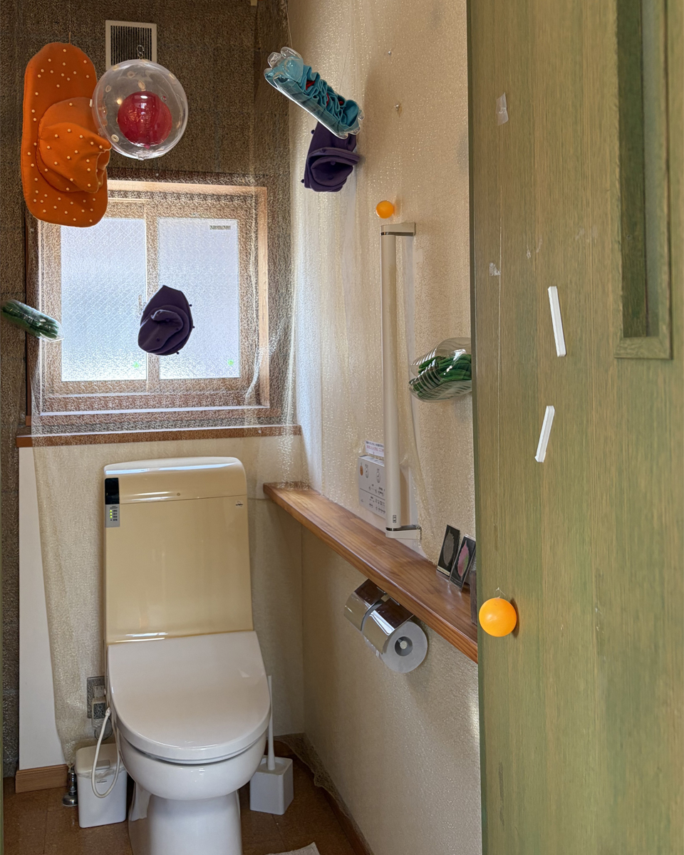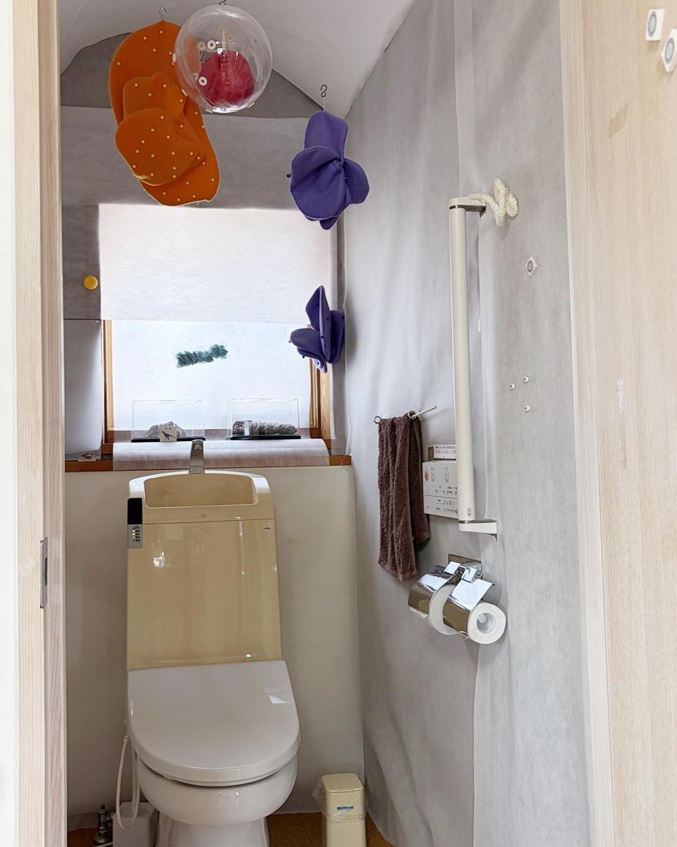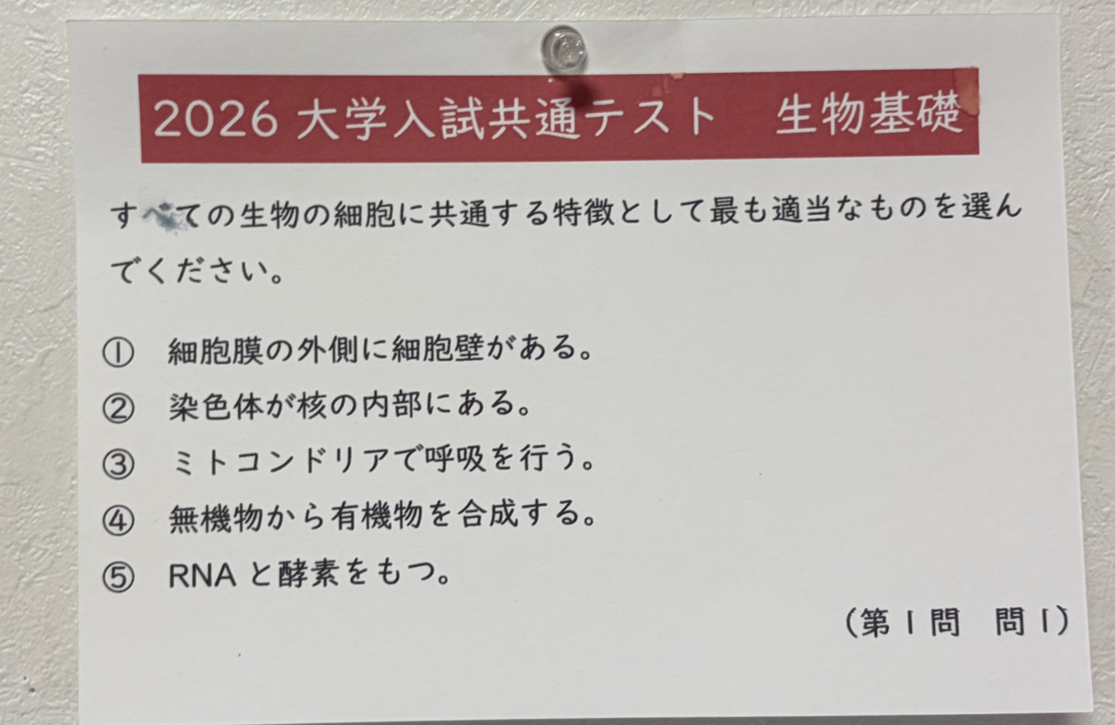 理科ハウスの展示は面白いだけではなく、深い知識にもつながっている。例えば、トイレの展示。ふたつあるトイレのうち、ひとつは植物細胞、もうひとつは動物細胞を表している。見た目のユニークさに目を奪われがちだが、注意深く見比べると、サイズやモチーフの違いに気がつく。トイレの横には大学入試共通テスト「生物基礎」の問題が掲示されていた。受験で問われる知識も、展示の細部にまで盛り込んでいるのだ。