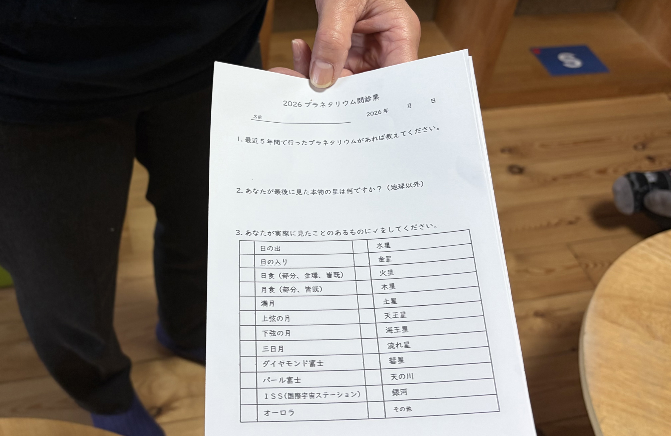 プラネタリウムに入る前には、「問診票」を書いてもらう。「あなたが実際に見たことのあるものにチェックを入れてください」。用紙には、日の出、日の入り、日食、月食、満月、上弦の月……と項目が並ぶ。