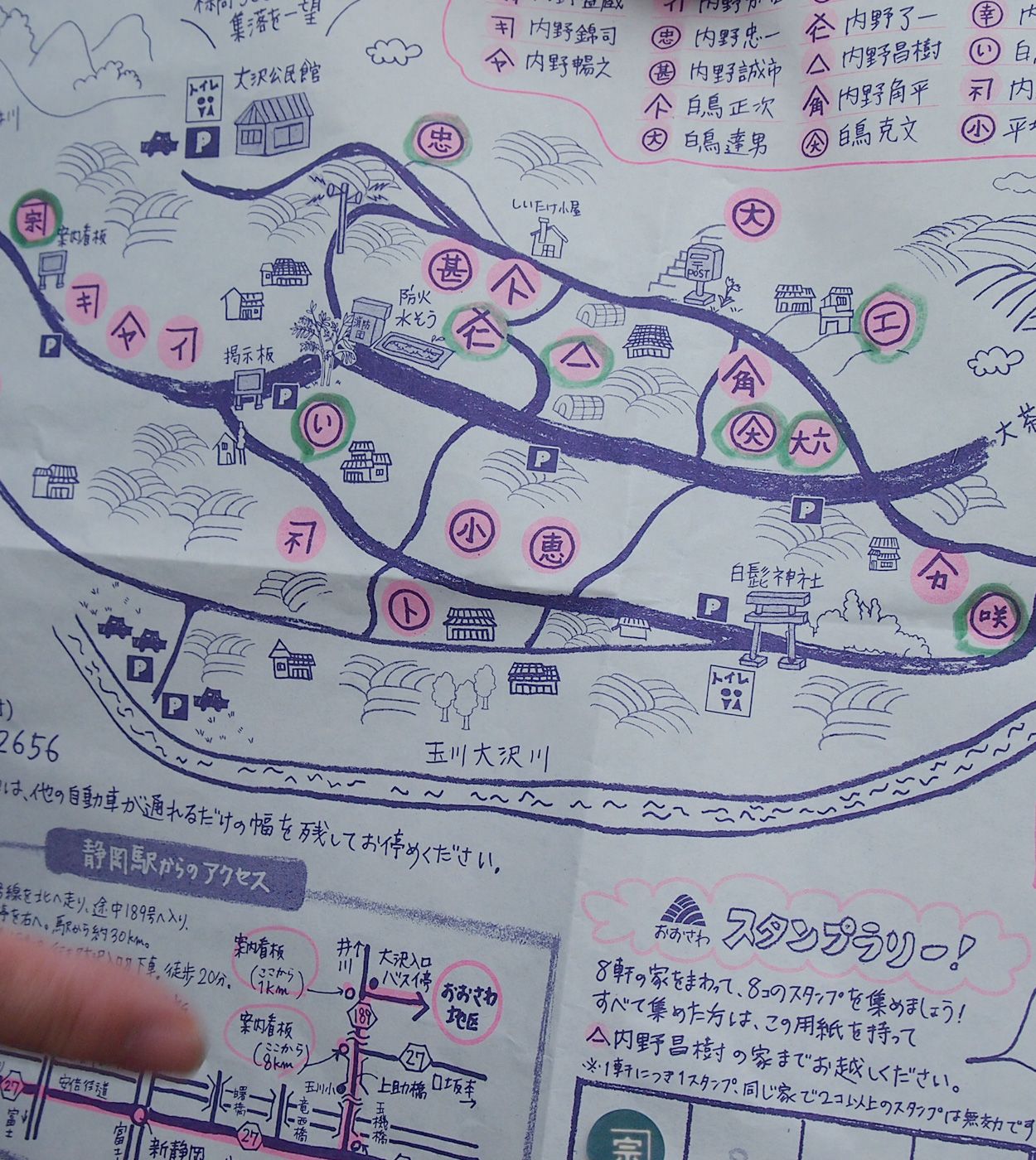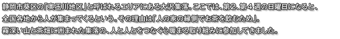 これから向かう予定の葵区大沢地区は、霧深い山と茶畑に囲まれた戸数23の小さな集落。この場所で、第2・第4週の日曜日のみ、それぞれの民家が縁側を解放し、お茶とお茶請けを提供する「おおさわ縁側カフェ」という街ぐるみの企画をおこなっている。そこでお茶しようというわけだ。