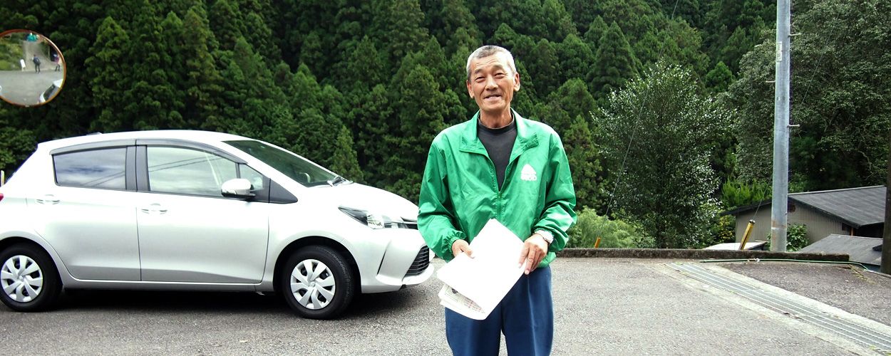 本当に「到着」したのだと分かったのは、カーブを抜けた先に、こちらを向いてポツンと立っている高齢の男性の姿を見つけたときだった。車が近づくと、男性もゆっくりと歩いてくる。