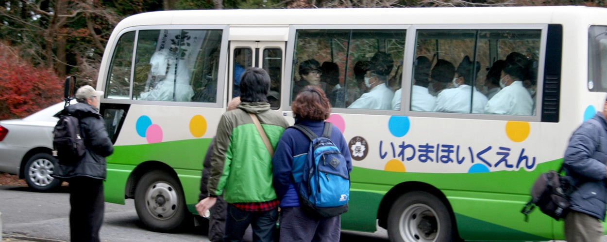 神事を終えた神主さんと天狗のご一行は、バスで麓に向かう。保育園のバスを使っているところがローカルでグッド