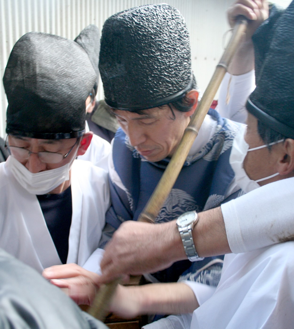 観客のフライングを抑えるために、天狗たちがいる。天狗は竹の棒を持っていて、祠のすぐ横に立ち、それぞれの竹の棒を交差させて即席のバリケードを築く。これで神主が儀式をしている間、観衆が手を伸ばしてもお供物には届かなくなるのだが、なかにはバリケードの隙間に手を突っ込んで供物を狙う人もいる。天狗はそういう不届き者を排除する。僕はちょうど不届き者(かなりのご老人!)と天狗がやり合っているところを目撃したんだけど、観衆に罵倒され続けた天狗の無言の反撃はなかなかのものだった。その攻防の最中、不届き者にはこんな罵声が浴びせられていた。